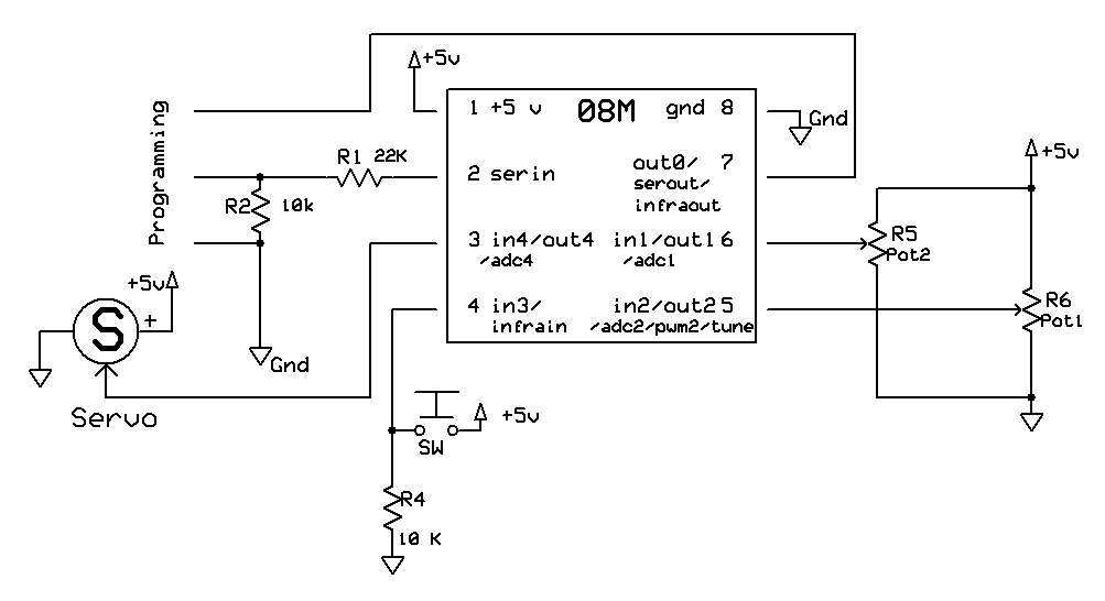 In the schematic above there are two potentiometers connected to the PICAXE through pin 5 (adc2) and pin 6 (adc1). Examine the wiring of the potentiometers, R5 and R6. Note that both have one end connected to +5 volts with the other end going to ground. The center connection, which is controlled by the shaft on the pot, goes to the PICAXE pin. That pin has a variable voltage between 0 and 5 volts on it depending on the position of the wiper on the pot. The two PICAXE pins that are connected to the pots are called ADC pins, this stands for Analog to Digital Converter. In other words these pins can take a variable analog voltage and convert it to a digital number between 0 and 1023. These numbers can be used to set the upper and lower range of the servo. When the pot is turned towards the 5 volt contact the PICAXE "sees" 5 volts and converts that to the numeric value 1023. When the pot is turned to the end closest to ground the PICAXE "sees" 0 volts and reports that as 0. Positions in between 0 and 5 volts are reported as numbers between 0 and 1023. (If you are wondering why the PICAXE uses what appears to be an unusual range of 0-1023 it is because 1023 is an even number to a computer. Remember that computers "think" in binary, base 2, where 1023 = 1111111111 binary.)