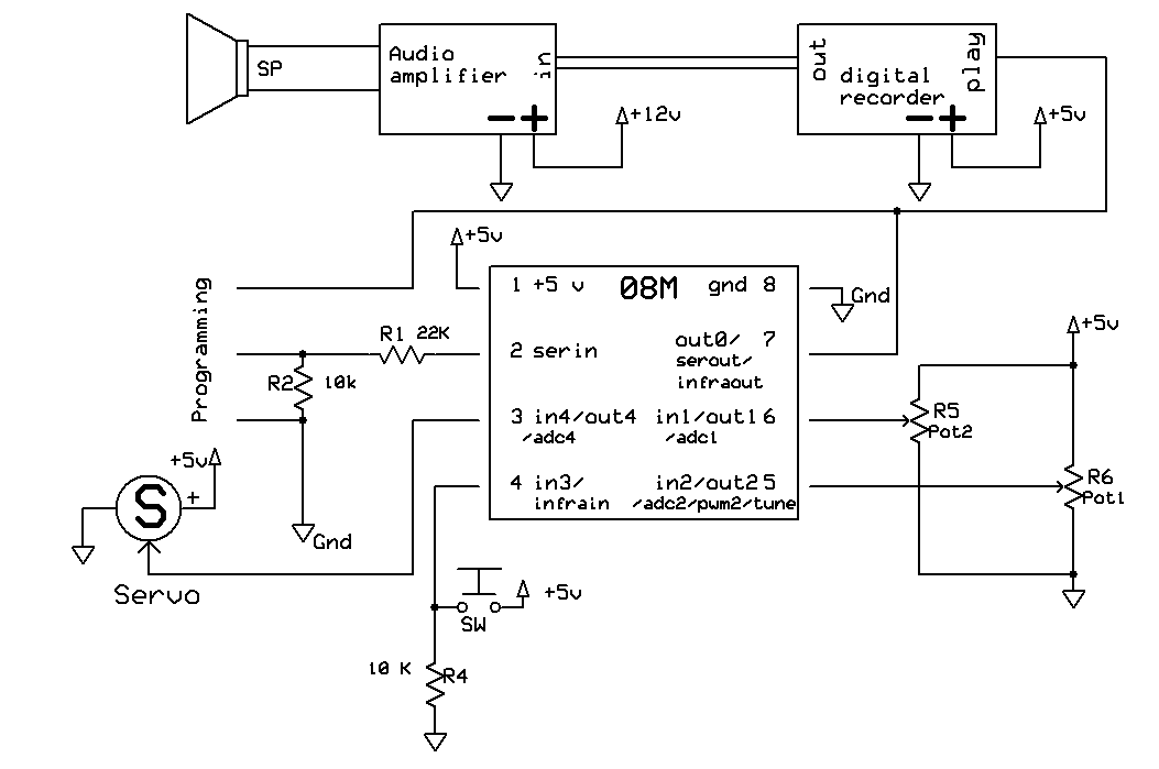 Any number of animated animals can be controlled by separate PICAXE 08M chips or as many as six can be simultaneously controlled by another of the PICAXE chips that has more pins available.