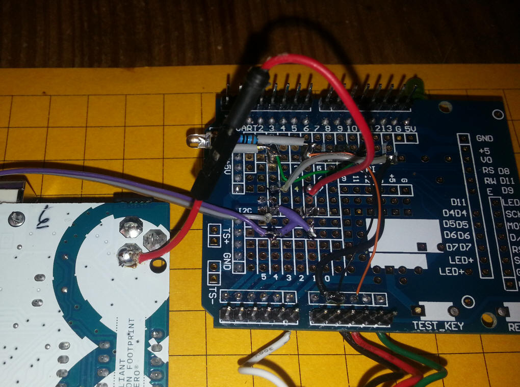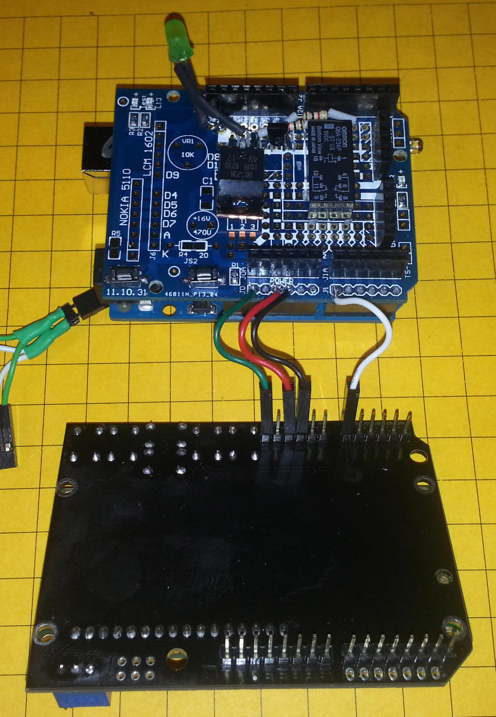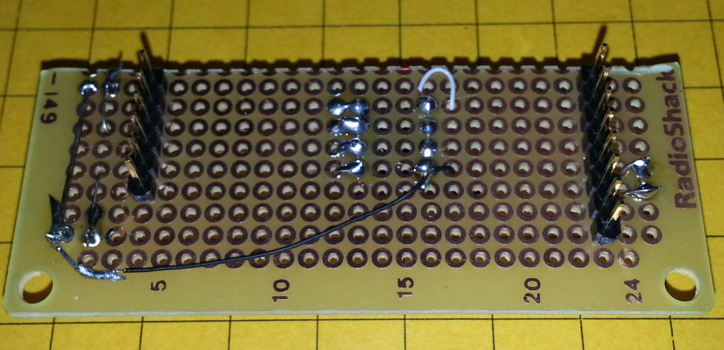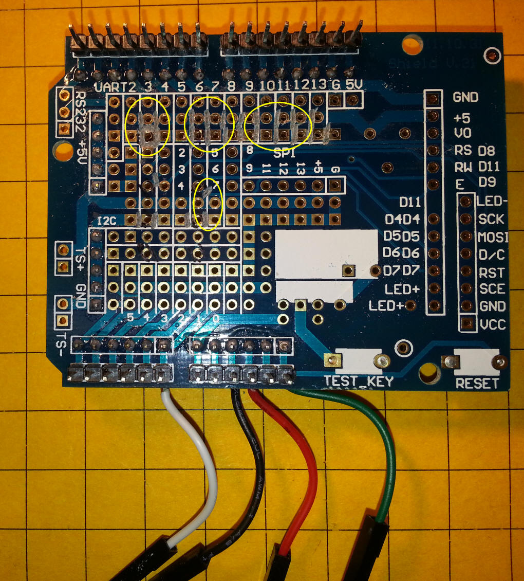 The next few photos show the 3 board stack. The four connections that go to the LCD board are shown here - they are necessary as the headers on the prototype board don't line up properly.