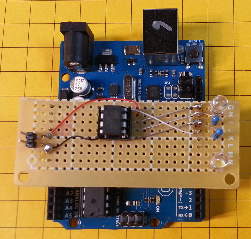 The simplest way that I found to program it was to use the Uno board as a programmer. Notes to make it happen are here: http://highlowtech.org/?p=1695 You have to install a program on the Uno chip to turn it into a programmer then connect the ATTiny85 and set the board (under tools) to the ATTiny85. The program is under Examples/ArduinoISP - Note that you have to burn the bootloader to get the chip to 8mhz otherwise it defaults to 1mhz. Rather than use jumper wires to connect the ATTiny to the Uno I made up a simple plug-in to hole the chip and connect to the proper pins. The ATTiny connects to two LEDs that were used to create a pair of ditch lights. The pins at the far left are for an external source of 5 volts for stand alone operation once programmed.