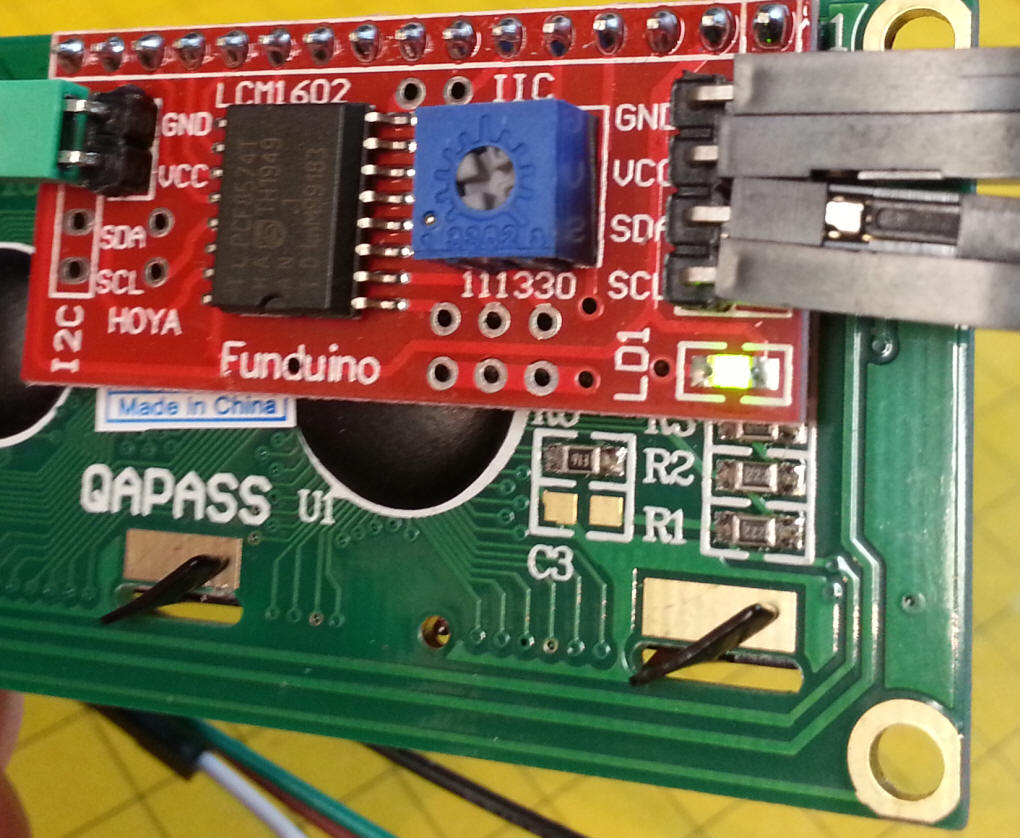 This view of the back of the unit shows the four connection pins, Ground, VCC (+ 5), SDA and SCL. These pins connect to the Uno board as follows: