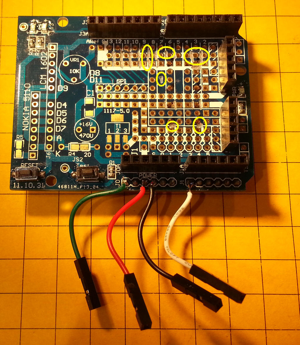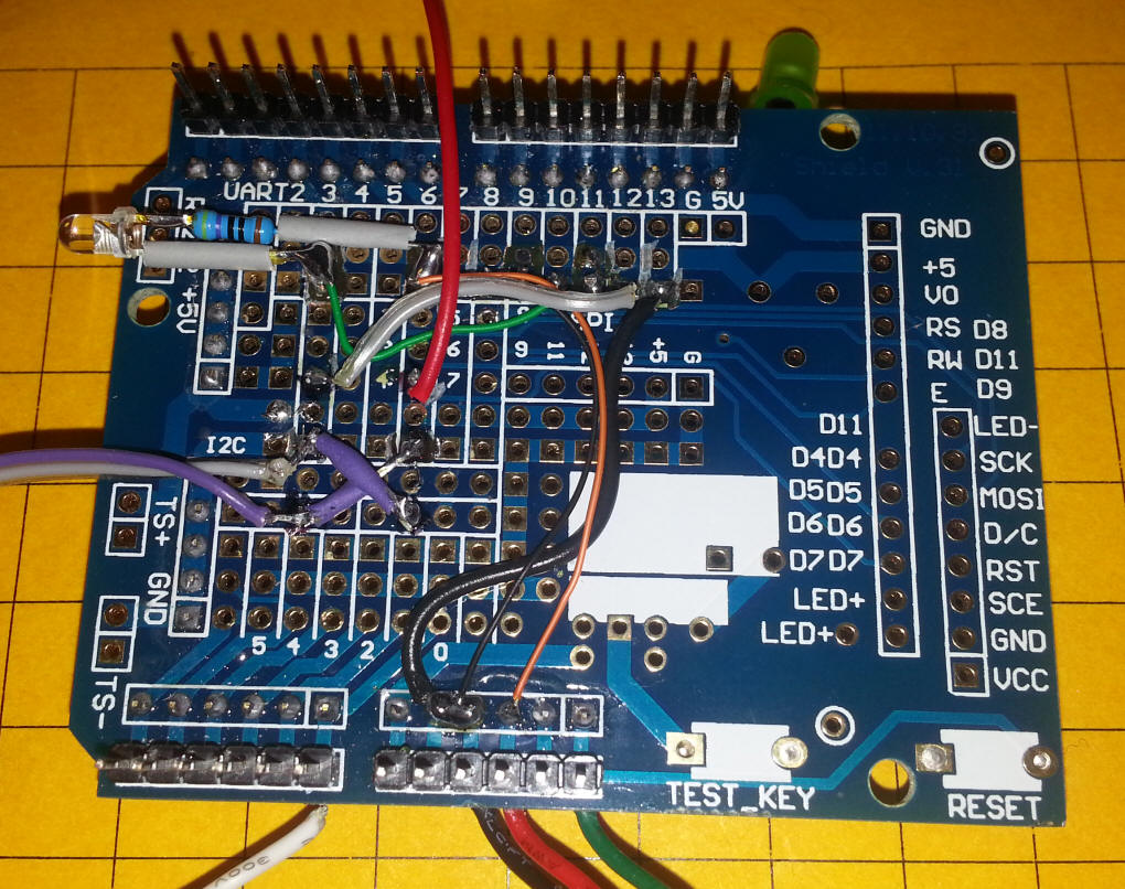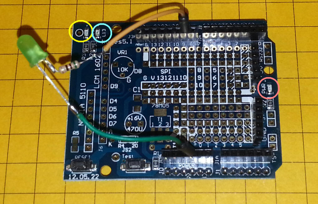 Add-on Board I ordered the board below from BangGood.com - part # SKU027705 - it is an empty shield that is good for prototyping. Three LEDs are included along with two switches. The POWER LED is circled in pink and an LED that is connected to pin 13 is circled in light blue and labeled L13. The LED to its left (circled in yellow) is labeled TEST - there is a single hole next to it - that is a connection to the anode of the LED - you can put a jumper between that hole and any output pin to use the LED. Both of these LEDs have current limiting resistors in series with them. The button labeled TEST is also wired to a single pin. The switch is pulled high with a pull-up resistor - the test point will go low when the button is pressed. The test point can be connected to any input pin.