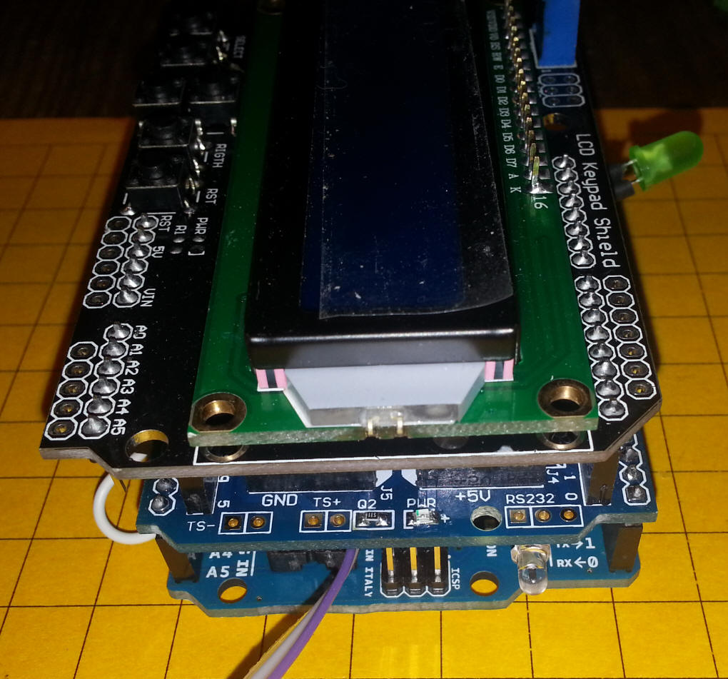The board has only a few components, including a reset switch, test switch and three LEDs. Its primary failing is that its two female headers do not line up so that you can add another shield above it. Fortunately this did not pose a problem with this project, as you will see.