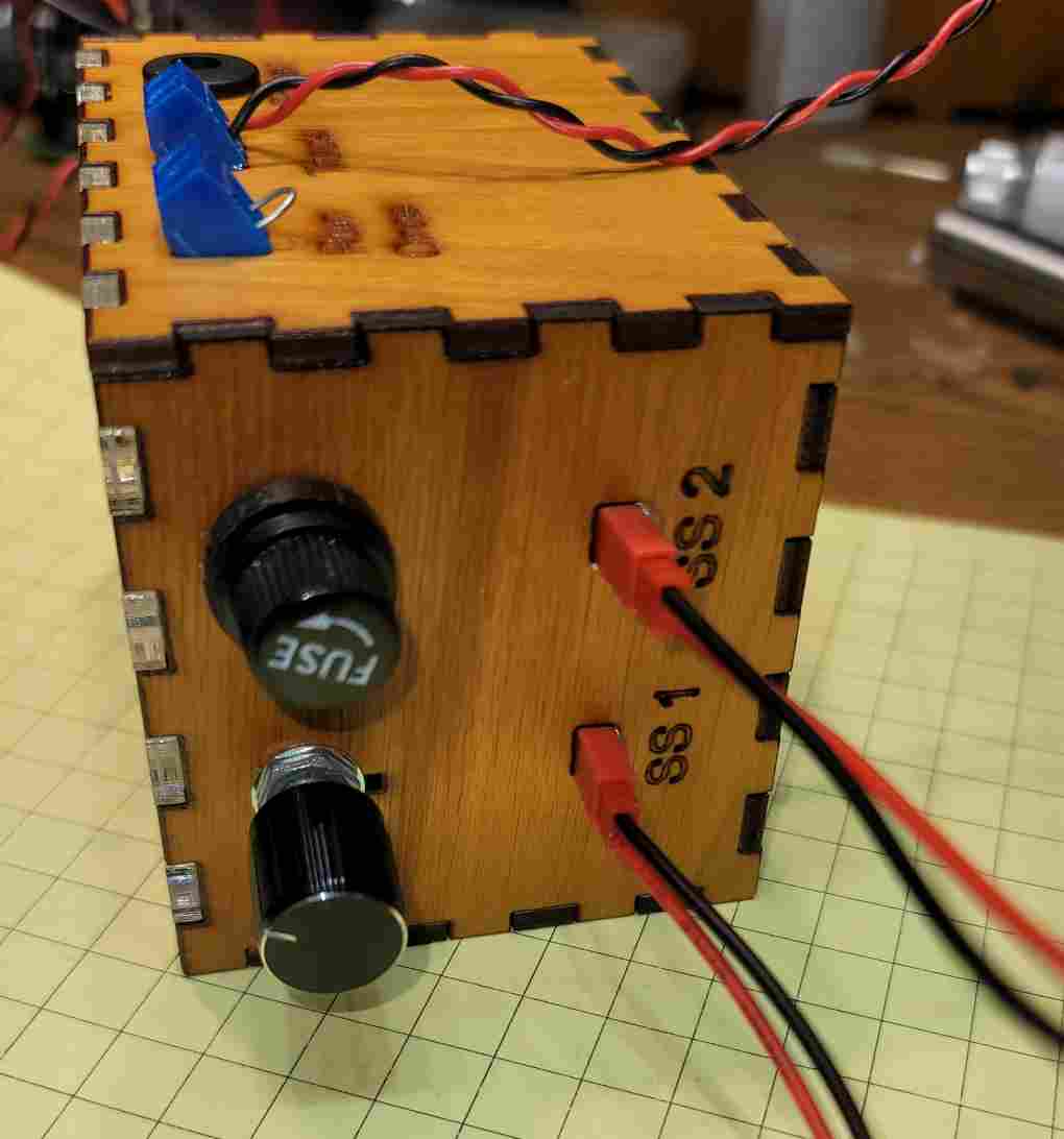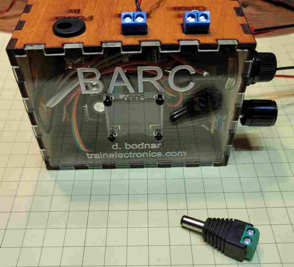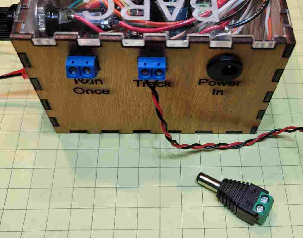 Laser Cut Case These photos show the laser cut case and various connections. The power connection (9-23 volts DC) is a 2.1mm plug - an adapter is shown in this photo. The center pin is positive.