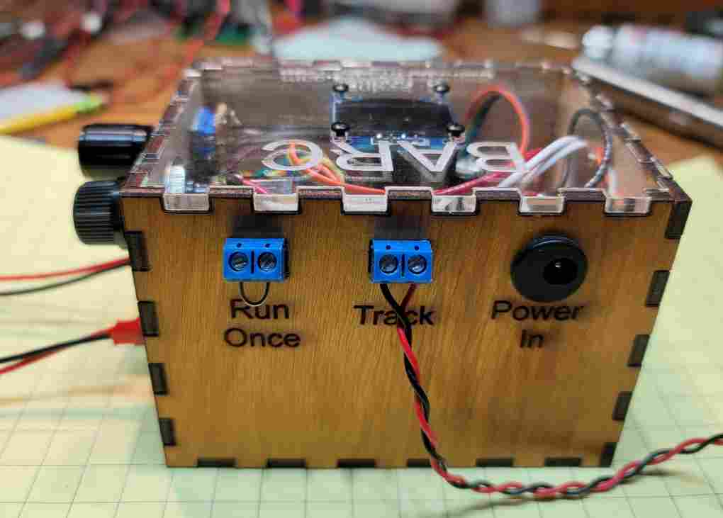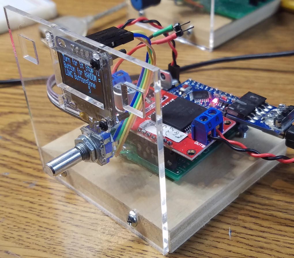Overview Some years I designed a very nice auto-reverse unit called the BARC (Blinking Auto Reverse Controller) - it is based on a 16F88 PIC processor and slowly accelerates and decelerates a train or trolley on a point-to-point line. The controller works very well as evidenced by the fact that one has been operating 24/7 on the layout at Pittsburgh's Children's' Hospital since 2009 . For more information on that unit see: http://www.trainelectronics.com/autoreverse/basic/NEW_unit.htm I have been working with Arduino microcontrollers for a few years and decided that it was time to redo the BARC (now renamed the Brilliant Auto Reverse Controller ) for the Arduino. The hardware is composed of an Arduino Pro Mini or Uno, one of a number of solid state H-bridges, a small but very readable OLED display, a rotary encoder and a few reed switches. This photo is of the Uno based prototype. As you can see the wiring is minimal. The only parts that attach to the Arduino are an H-Bridge (at far left) a 0.9" OLED display and a rotary encoder.
