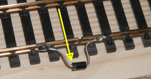 Operation Connect the power output from the H-bridge to a point in the track between the two diodes. This drawing shows the correct wiring for a G-scale layout. Note that the diode has its band to the right. For an HO scale layout the diodes must be installed with the opposite polarity, that is with the band on the diode to the left.