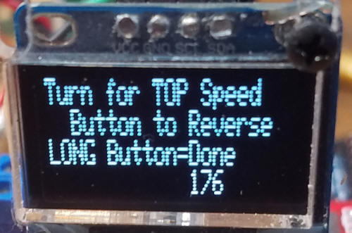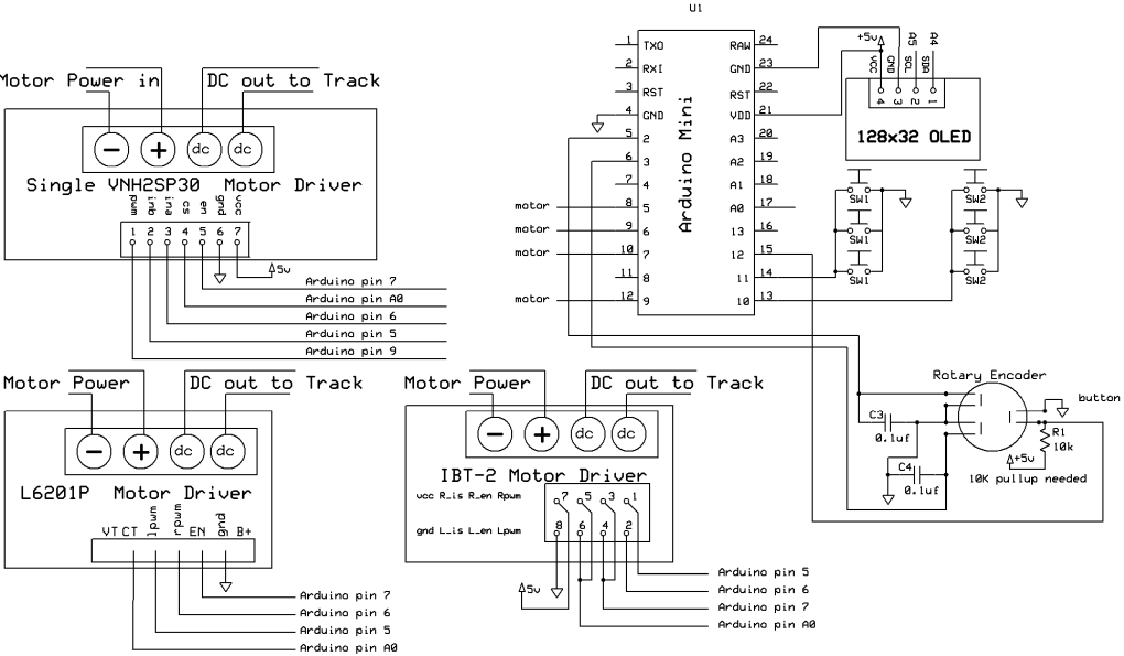 BT-2 - 27 volts at 43 amps from eBay or Amazon - this device is well suited for large scale use as it works on voltages as high as 27 volts and can supply 43 amps! This device has 8 control pins. It has two PWM inputs. When rpwm receives PWM pulses and lpwm is held low the motor spins in one direction. When rpwm is held low and lpwm receives PWM the motor spins in the other direction. miniIBT - 30 volts at 5 amps from eBay or Amazon - This H-Bridge works in the same manner as the BT-2. Most of my development was done with the red VNH2SP30 board. Unless you are working with large scale trains which need more than 16 volts it should serve your needs nicely. The OLED display connects to +5 volts, ground and pins A4 and A5. On some Pro Mini's these pins are not on the edge of the unit but on the inner portion. On the Uno they are easily identifiable. The rotary encoder works best if two small capacitors are soldered directly to the output pins as shown. The button goes to digital pin 12 which is held high with a 10K resistor. Note that the encoder output pins go to digital pins 2 and 3. This cannot be changed as those pins support interrupts which are used in the sketch. Two or more reed switches can be connected to digital pins 10 and 11. If you use more than one they should be wired in parallel, not in series.