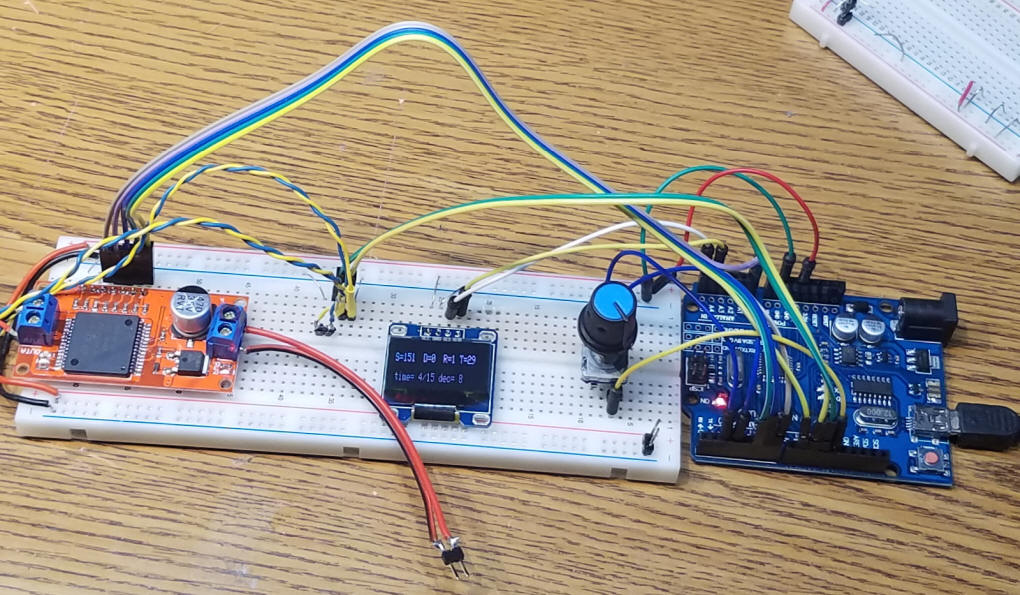Software The program has to be set up somewhat differently depending on which H-Bridge you use. If you are using the red VNH2SP30 H-bridge one procedure is needed. If you use either of the other two H-Bridges the commands used are different. To simplify this process for you I have added code that performs a conditional compilation. If you leave the line that reads #define motorType as it is the program will compile for the VNH2SP30. If you comment out that line so that is looks like this: //#define motorType the program will compile so that either of the other two H-Bridges will work. The conditional sections start out with #if defined (motorType) and end with #endif TEST CODE FOR ENCODER & H-Bridge file name: BARC-Interrupt-encoder_motor_OLED_-test-V3-7 /* d. bodnar - 2-15-2017 working fairly well Conditional Compilation based on #define motorType comment it out for miniIST 5 amp board remove comment /// for 15 volt red board */ //#define unsigned char byte char Ver[ ] = "3.7"; #define motorType // comment this out for miniIST board - leave active for red board int menuCode = 0; #include<EEPROM.h> #include <SPI.h> #include <Wire.h> #include <Adafruit_GFX.h> #include <Adafruit_SSD1306.h> #include <Entropy.h> #define OLED_RESET 4 Adafruit_SSD1306 display(OLED_RESET); int n = 1; int i = 0; #define ledPin 13 // the number of the LED pin #define buttonPin 12 // 8; // button on rotary static int pinA = 2; // Our first hardware interrupt pin is digital pin 2 - don't change static int pinB = 3; // Our second hardware interrupt pin is digital pin 3 - don't change volatile byte aFlag = 0; // volatile byte bFlag = 0; // volatile byte encoderPos = 0; // volatile byte oldEncPos2 = 0; // volatile byte oldEncPos = 0; // volatile byte reading = 0; // int old_pos = encoderPos; int dir = 0; // direction int buttonState = 0; unsigned long currentTime; //unsigned long lastTime; unsigned long interruptTime; unsigned long holdTime;// check to see if it is held for 1 sec + int FwdRev = 0; // Rotary- 0 for backwards, 1 for forwards int b0; int b1; int b2; int accelDecelRate = 10; // speed of accelerate & decelrate // pins 4, 5, 6, 7 are available for motor board #define motorPWM 9 // only on PWM: 3, 5, 6, 9, 10, and 11. #if defined (motorType) // for red single VNH2SP30 board #define motor1 5 #define motor2 6 #define enable 7 #define currentDraw A0 //#define motorPWM 9 // only on PWM: 3, 5, 6, 9, 10, and 11. #else //// works with L6201P board #define motor1 = 5; #define motor2 = 6; #define enable = 7; #define currentDraw = A0; #endif #define Station1 10 // station stop trigger 1 #define Station2 11 // station stop trigger 2 int oldSp = 999; int timeToDecel = 5; int timeToStop = 10; boolean decelFlag = 0; int speedFast = 220; int speedSlow = 64; boolean exitFlag = 0; int stationStopTime = 0; int stationStopTimeSave = 0; int stationStopPercent = 0; int stationStopCount = 0; int stationStopDone = 0; int laps = 0; int SScount = 0; boolean randomSS = 0; // flag for random @ Station Stop (1) or not (0) boolean randomSSchangeFlag = 0; void setup() { Entropy.Initialize(); pinMode( Station1, INPUT_PULLUP ); pinMode( Station2, INPUT_PULLUP ); display.begin(SSD1306_SWITCHCAPVCC, 0x3C); // I2C addr 0x3D (for the 128x64) display.clearDisplay(); display.display(); //currentTime = millis(); // lastTime = currentTime; pinMode(motorPWM, OUTPUT); pinMode(motor1, OUTPUT); pinMode(motor2, OUTPUT); pinMode(enable, OUTPUT); pinMode(ledPin, OUTPUT); pinMode(pinA, INPUT_PULLUP); pinMode(pinB, INPUT_PULLUP); pinMode(buttonPin, INPUT_PULLUP); attachInterrupt(0, PinA, RISING); attachInterrupt(1, PinB, RISING); Serial.begin(115200); Serial.print("BARC " ); Serial.println(Ver); display.setTextSize(2); display.setCursor(30, 0); display.setTextColor(WHITE); display.print("BARC"); display.display(); display.setTextSize(1); display.setTextColor(WHITE); display.setCursor(0, 16); display.print("Version "); display.println(Ver); display.setCursor(0, 24); display.print ("BUTTON for MENU"); display.display(); digitalWrite(enable, HIGH); currentTime = millis(); readEEPROM(); do { if (digitalRead(buttonPin) == 0) { // Serial.println("MENU SELECTED ON STARTUP"); doMenu(); break; } } while (millis() - currentTime <= 1500); digitalWrite(enable, HIGH); display.clearDisplay(); updateDisplay(); // delay(1000); currentTime = millis(); accelerate(); } //////////////////////////MAIN LOOP void loop() { display.clearDisplay(); updateDisplay(); checkStationStop(); checkTimeToSlowDown(); checkTimeExpired(); oldSp = encoderPos; setMotorSpeed(); buttonState = digitalRead(buttonPin); // new deceleration time? if (buttonState == LOW) { Serial.print ("LOW "); Serial.println((millis() - currentTime) / 1000); timeToDecel = ((millis() - currentTime) / 1000); writeEEPROM(); } } void checkTimeToSlowDown() { if ((millis() - currentTime) / 1000 >= timeToDecel && decelFlag == 0) { decelerate(); decelFlag = 1; } } void checkTimeExpired() { if ((millis() - currentTime) / 1000 >= timeToStop) { dir = !dir; decelFlag = 0; accelerate(); currentTime = millis(); laps++; } } void checkStationStop() {//button hit? direction OK? if so Do Station Stop if ((digitalRead(Station1) == 0 && dir == 0) || (digitalRead(Station2) == 0 && dir == 1) ) { unsigned long tempTime = millis(); // store time to skip timing here // Serial.println(""); // Serial.print(" before CT= "); Serial.print((currentTime - millis()) / 100); // Serial.println(""); // Serial.print(" millisBefore= "); Serial.println(millis() / 100); unsigned long tempTime2 = (millis() / 100); doStationStop(); // Serial.print(" millisAfter= "); Serial.println(millis() / 100); // Serial.print(" Diffv After= "); Serial.println((millis() / 100) - tempTime2 ); currentTime = currentTime - tempTime + millis() ; //- tempTime - 500; // Serial.print(" CT= "); Serial.print(currentTime / 100); //Serial.println(""); } } void doStationStop() { // Serial.print(" percent = "); // Serial.print(stationStopPercent); // Serial.println(millis() / 100); int 