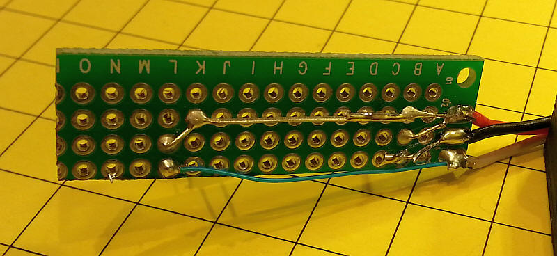 The back of the board shows the connections to the 3 wire cable that goes to the main circuit board. I used two servo cables to connect the photo transistors and the lasers to the circuit.