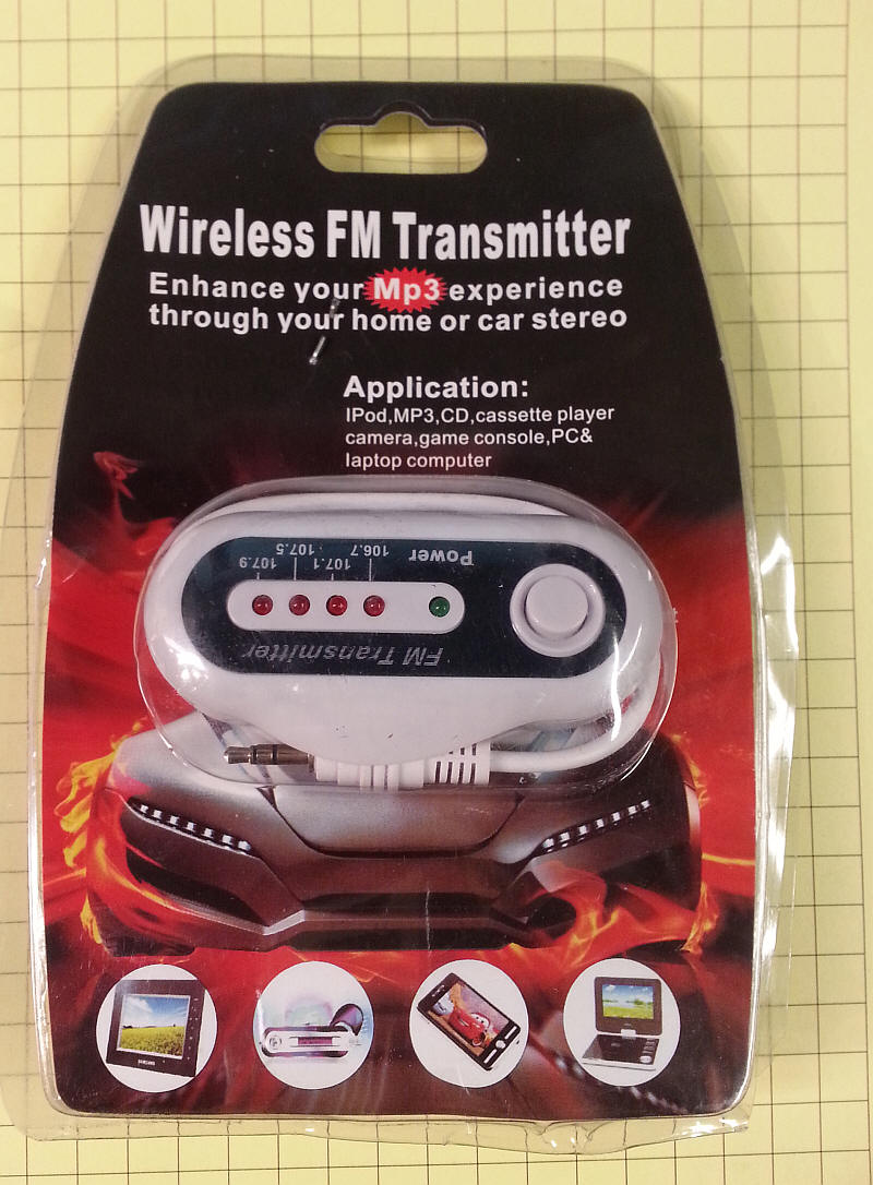 | "RadioActive" Defect Detector I have experimented with several inexpensive FM transmitters like the one shown below. Each of these units is designed to connect an MP3 player or cell phone to a car's FM radio so that you can listen through the car's speakers. This device was purchased from eBay for less than $5.00, delivered. See: eBay Search