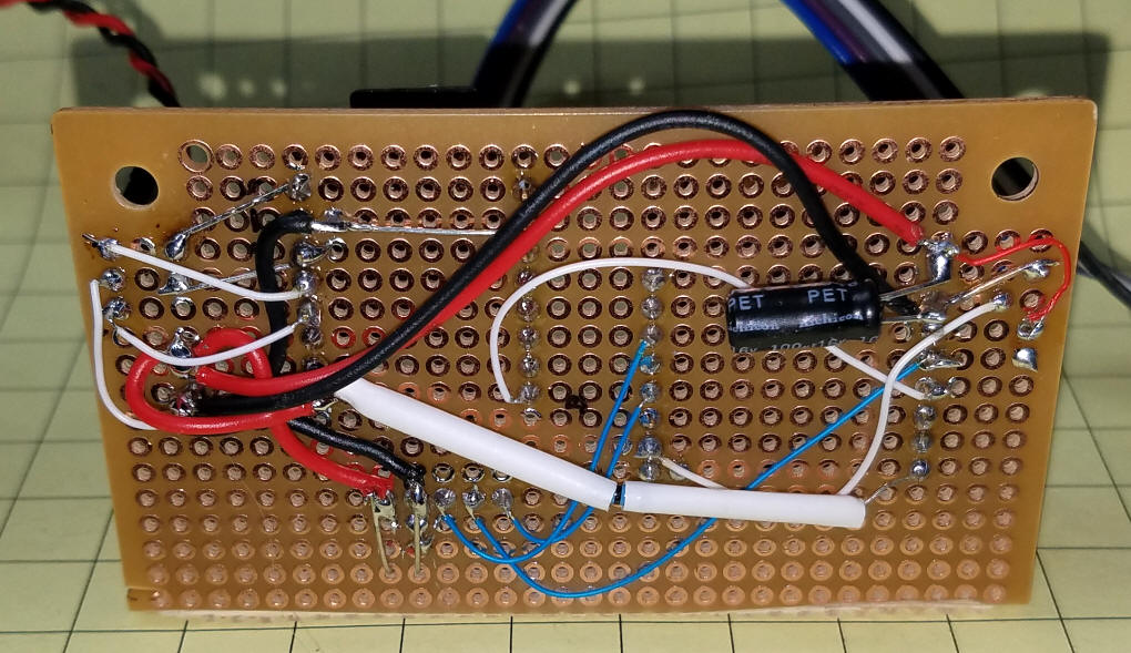 Most of the wiring is on the back of the board. It follows the schematic. The only part that is not shown on the schematic is the black capacitor that was placed on the power input connections to filter the DC power when I used a noisy external power supply. It is not necessary if you power with USB through the Wemos D1. The 1K resistor is under the white tubing.