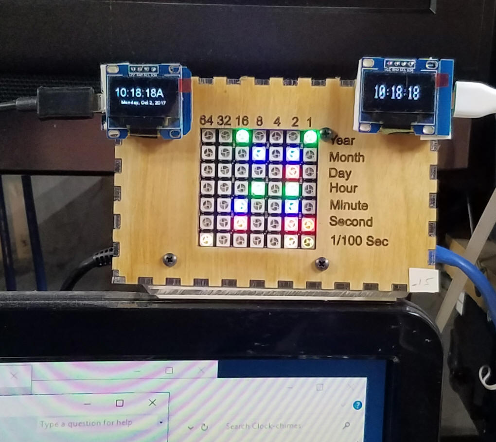 Introduction I have built a number of clocks over the years starting with a binary coded decimal kit that looked something like this when completed http://www.jerryselectronics.com/diykits/kbc00100/kbc00100.htm I recall building that in the 1970's. More recently I have build a number of digital clocks that synchronize with the time servers that can be accessed over the Internet. Several of them sit on top of my PC's monitor. The larger one is binary and the other two use an OLED display. All three get their time from the Internet. https://en.wikipedia.org/wiki/Network_Time_Protocol see: https://www.instructables.com/id/Simplest-ESP8266-Local-Time-Internet-Clock-With-OL/ My latest digital clock is based on this video and the code found there. https://www.youtube.com/watch?v=YUtqLjs-alo Many thanks to John Rogers who posted the video. It works very well but I wanted something that also gave me auditory announcements of the time. The classic way of doing this is with Westminster Chimes. Such chimes are found on most grandfather clocks as well as mantle clocks. While the Arduino that I am using for this project is capable of producing rudimentary sounds that could resemble Westminster Chimes I opted to use an MP3 player that sounded out recordings of the chimes. This gives much better audio quality and flexibility to use whatever sound you choose to play. One of my clocks is shown here. It continuously displays the time and sound the chimes at 15, 30, 45 minutes after the hour and on the hour where it chimes the number of the hour.