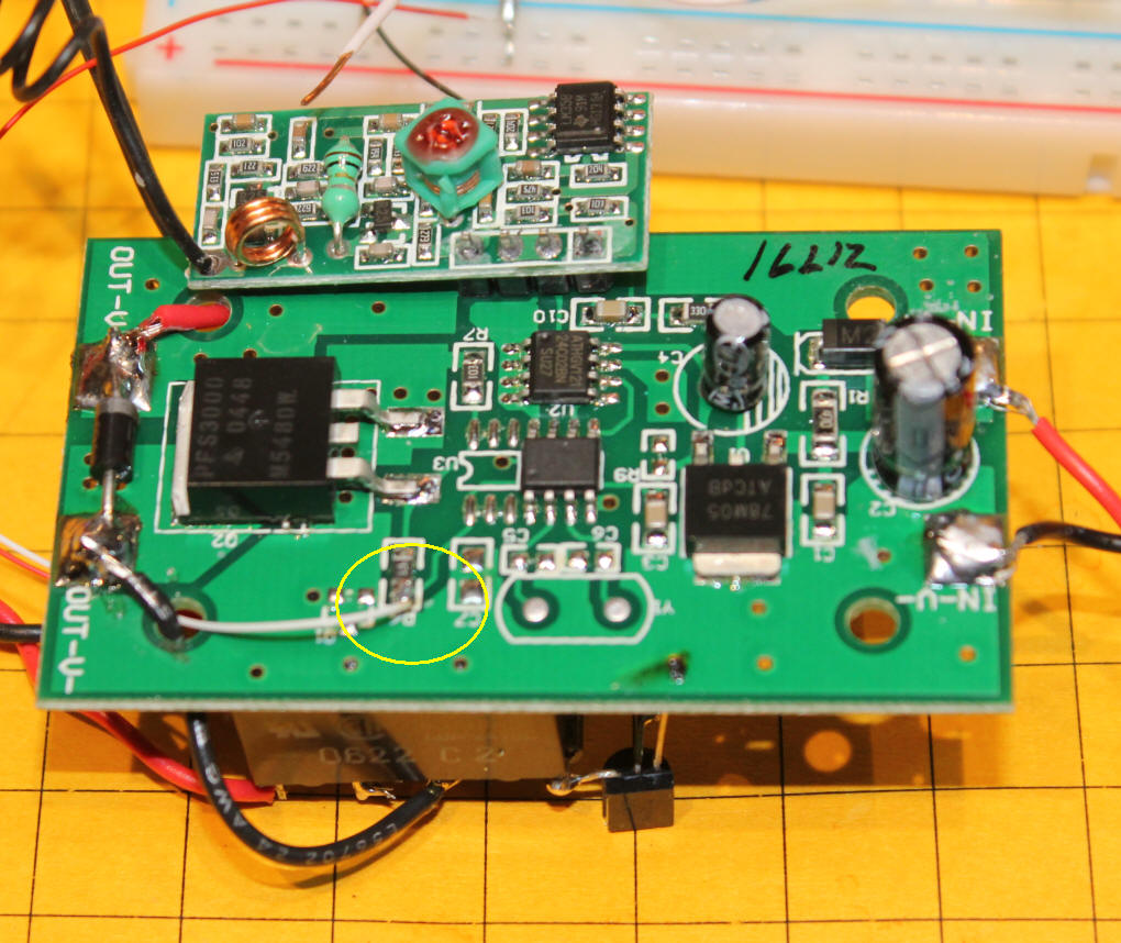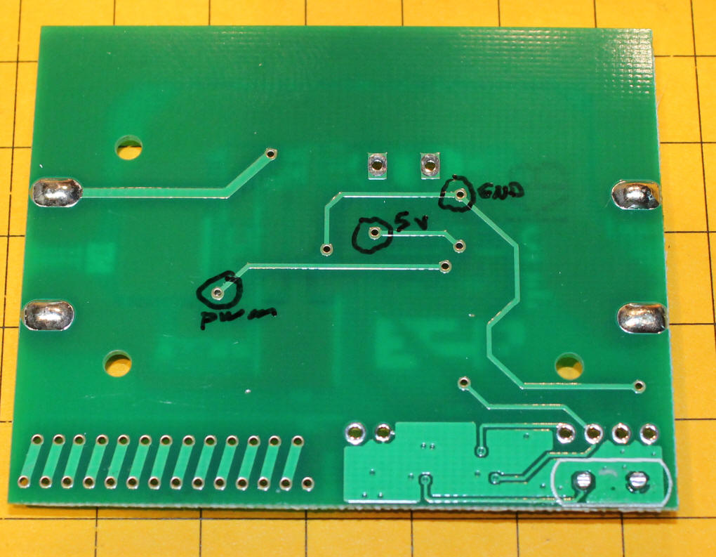 There is the front of the board. The receiver module is at the top. Note the yellow circled connection. This is where the white wire picks up the PWM signal. Power comes in from the right and leaves to the left.