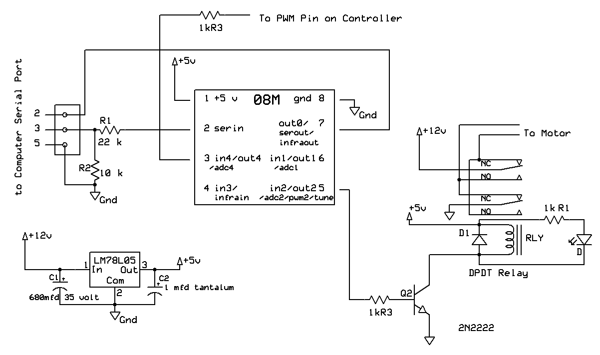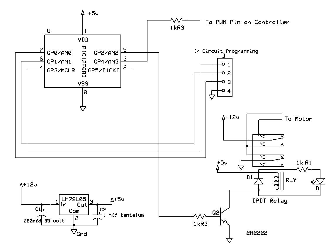 The transistor that operates the relay is added along with a 1K resistor that goes to its base from pin 5 on the PIC. The transistor must be oriented as shown with its emitter going to ground and its collector going to the relay. The PWM connection goes from the contact on the RC board to pin 3 on the PIC via a 1K resistor. This connection is used to detect if the power to the motor is on or off.