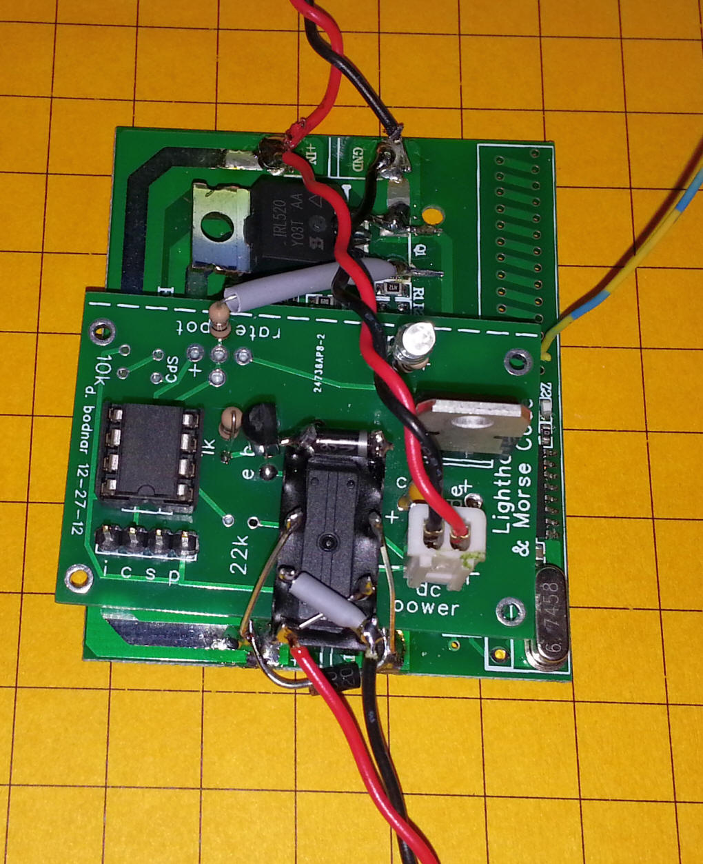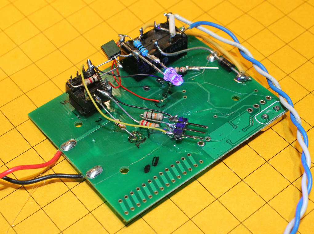The new reverse board is built on the board that I use for the lighthouse and Morse code beacons. This board does not have a set of holes for a DPDT relay but I have a good number of them in stock and it can easily be modified to accommodate a relay.