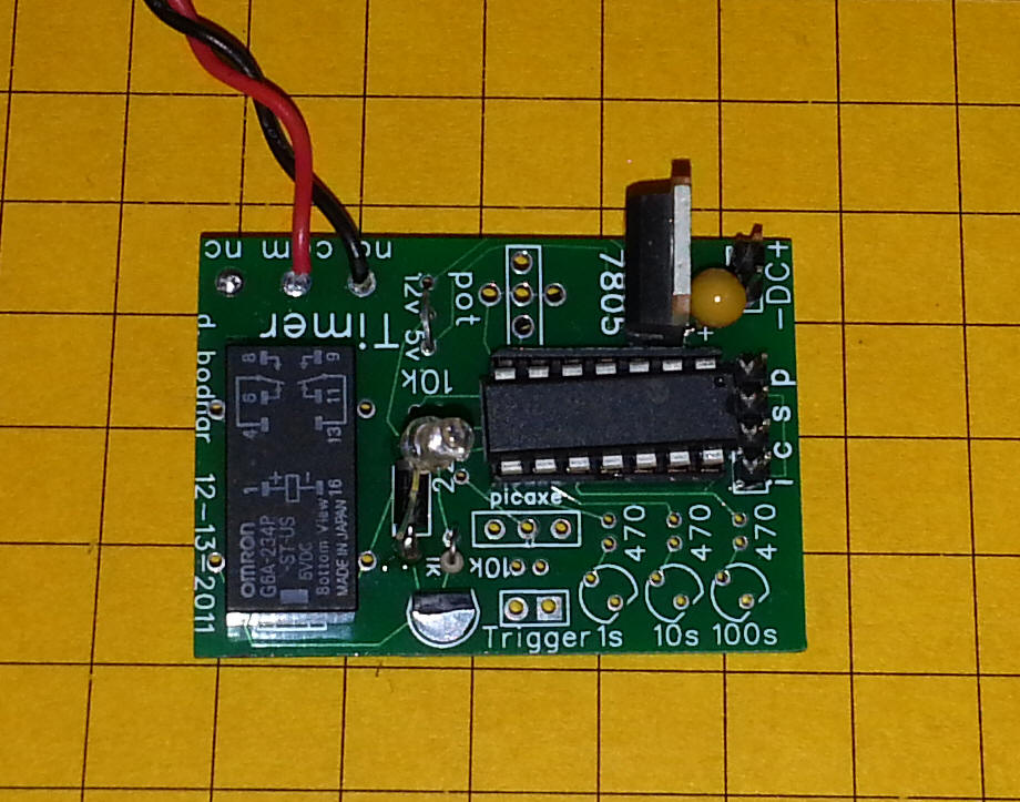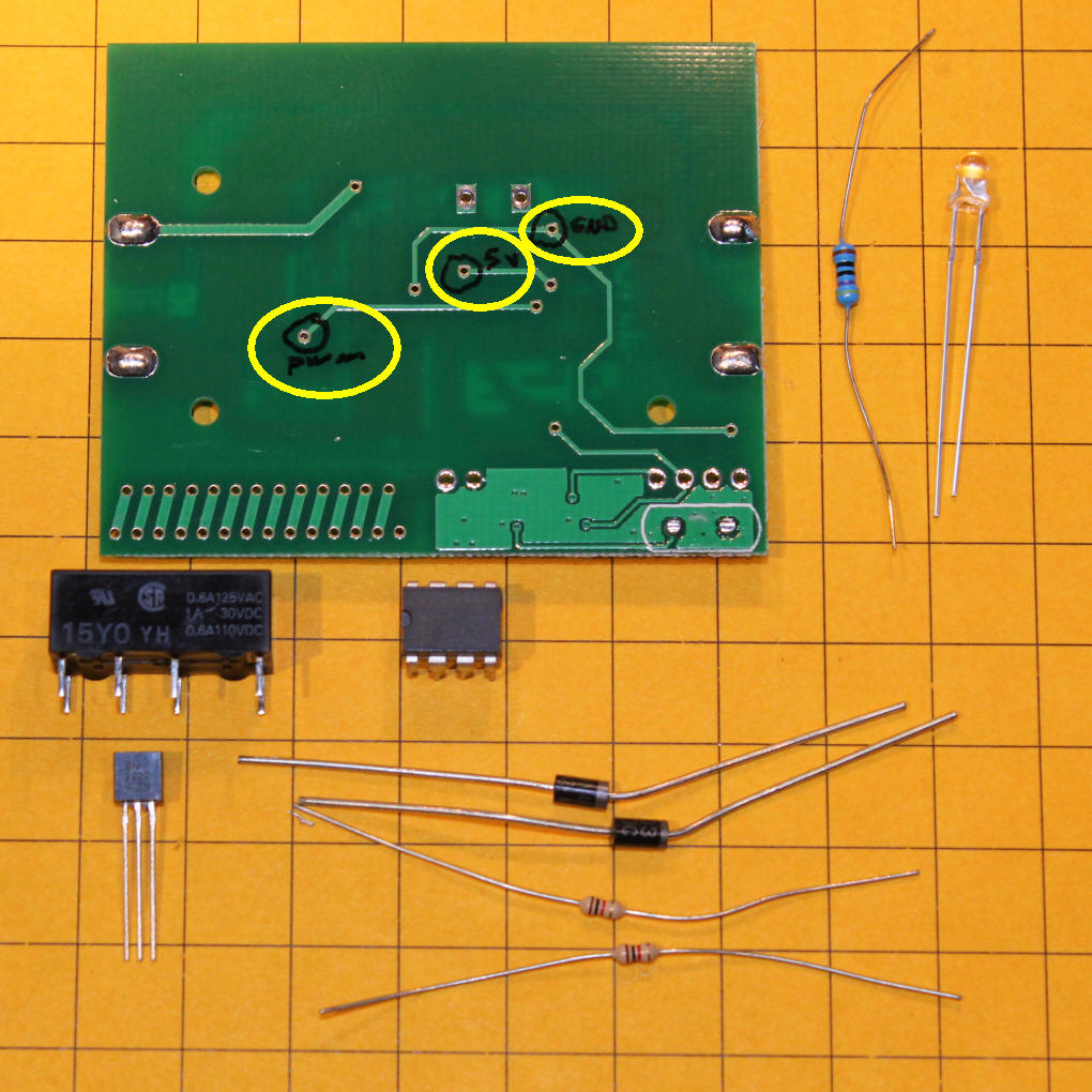 The parts below the board are a 5 volt, DPDT relay, a pre-programmed PIC 12F683, a 2N2222 NPN transistor, two generic diodes (I used 1N4003's) and two 1K resistors. There are two optional parts to the right, an LED and a 470 ohm resistor.