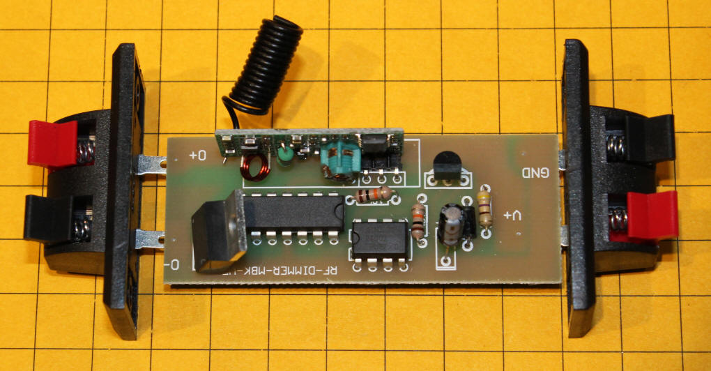 The microcontroller on this board is the 8 pin 12F683 seen in the upper right. The only other components are a 78L05 regulator, an NPN transistor and a few resistors and a capacitor. The 1K resistor at the bottom of the board will be connected to the PWM output pin on the RF receiver board. An LED in the bottom left shows whether the relay is latched or not.