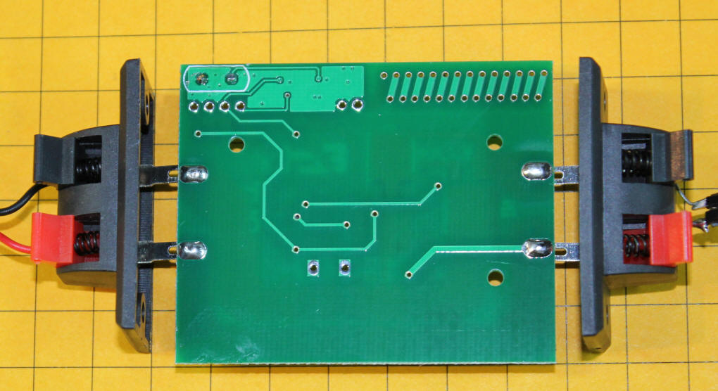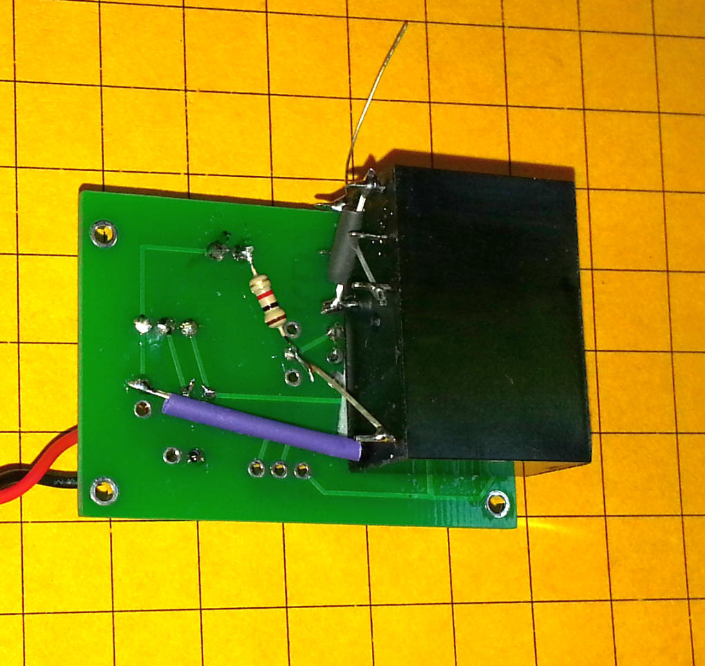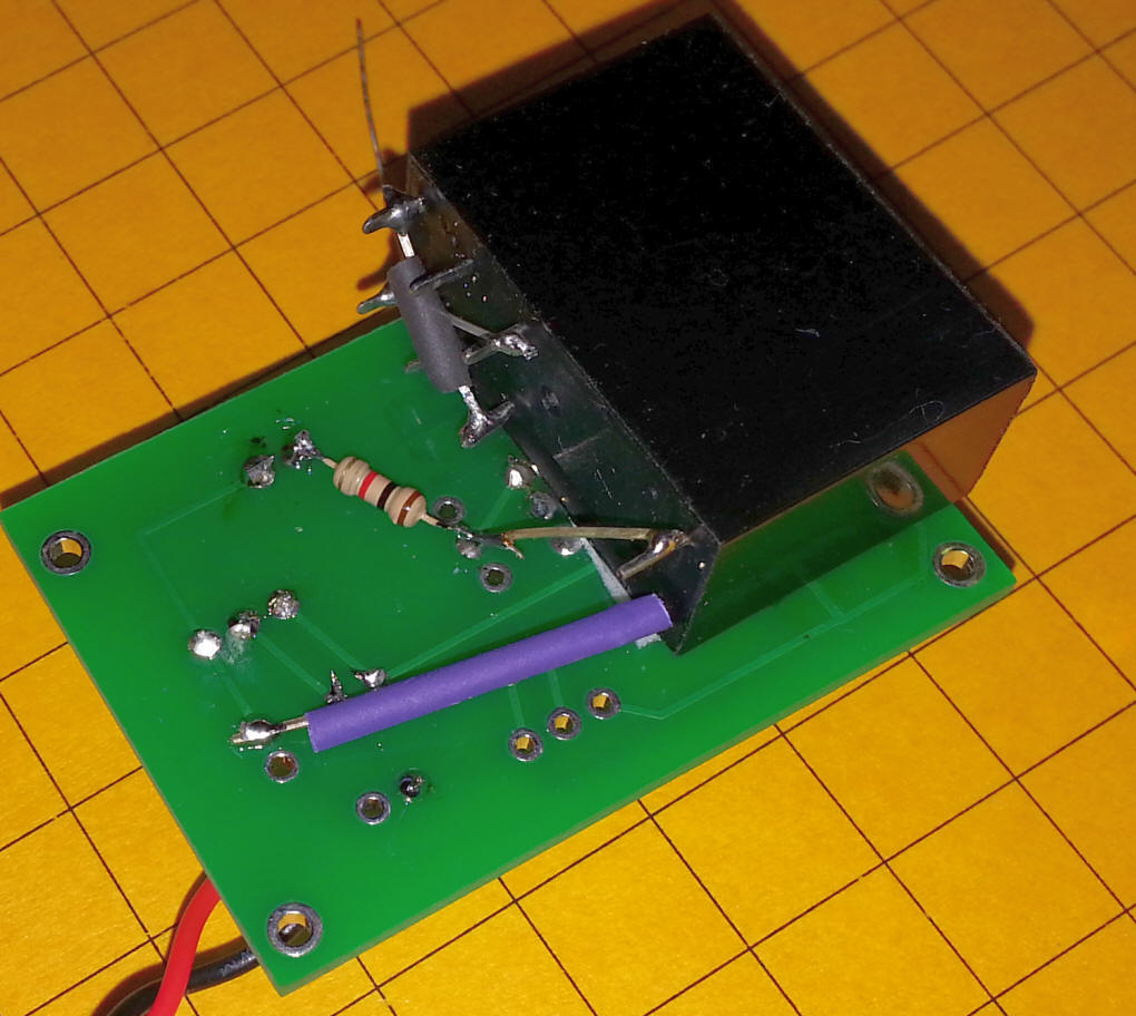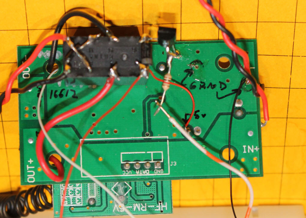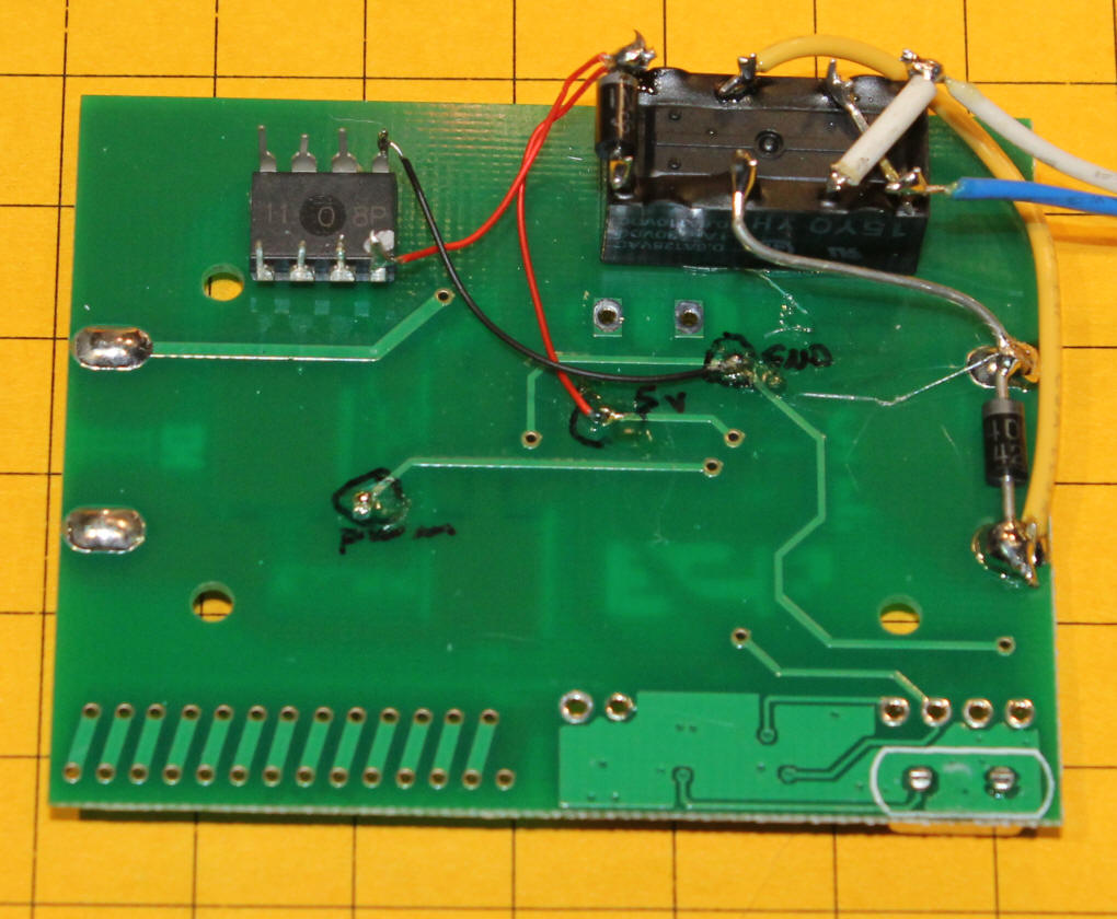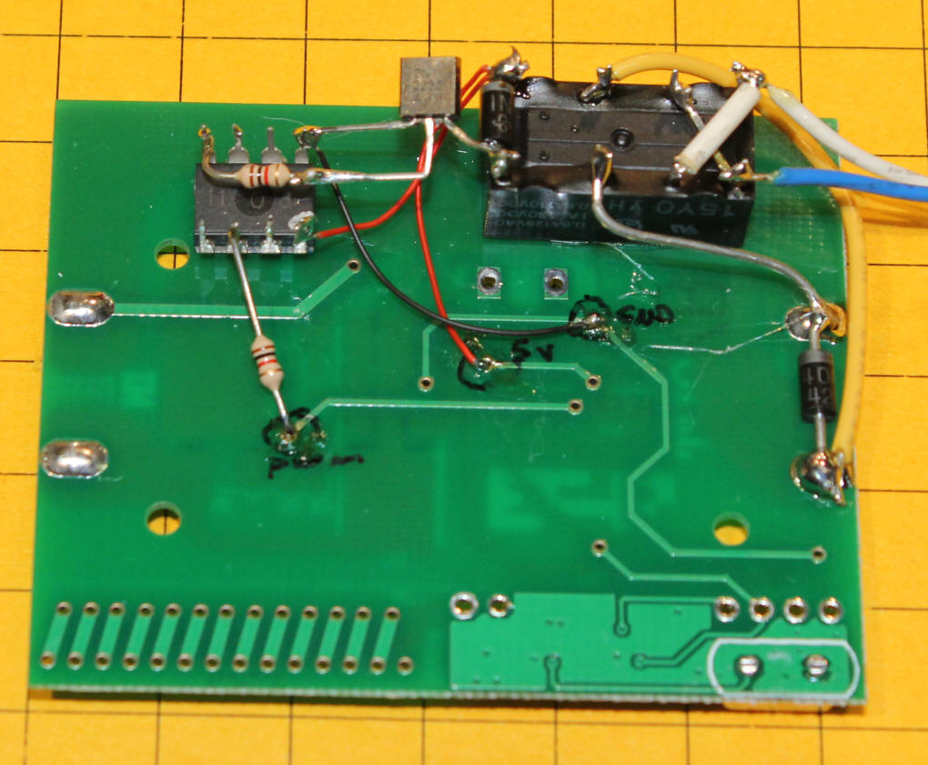 This view of the back of the board shows where ground and +5 volts can be picked up. The relay and transistor are at the top.