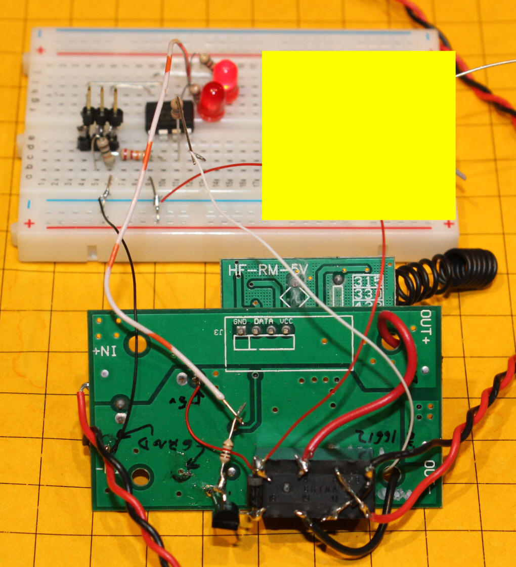 This is another version of the same board & circuit that utilizes a smaller 5 volt relay. The board has been mounted on top of the RF receiver board with foam tape.