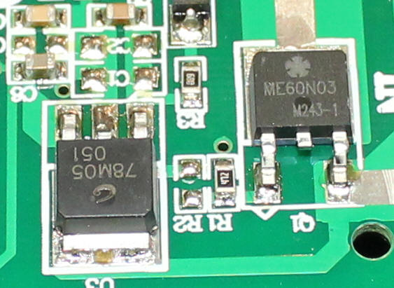 This close-up shows the voltage regulator and Mosfet and their markings.