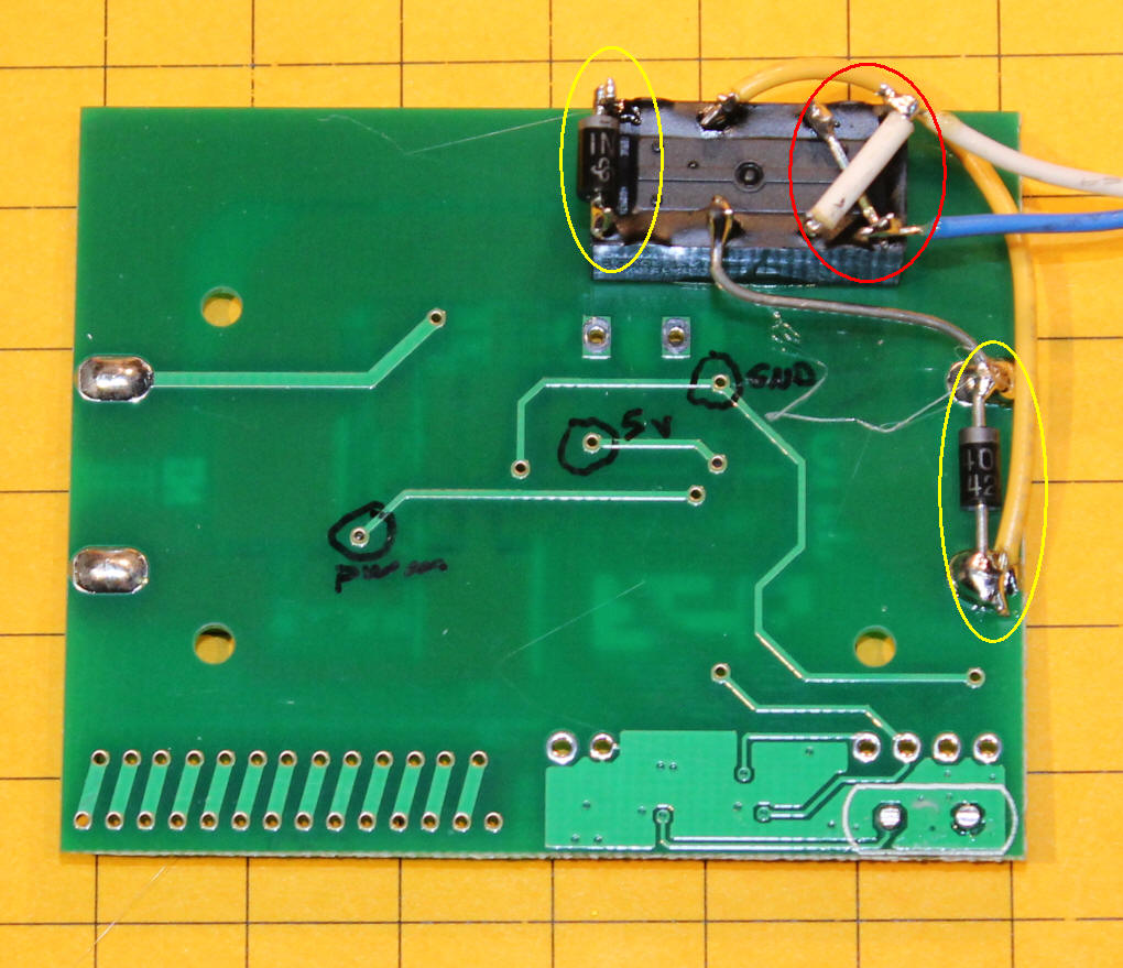 There are two diodes, circled in yellow. They must be mounted with their banded end, the cathode, oriented as shown. The center pair of relay pins go to the output power from the RC board. One of the diode's long leads is used to connect to one side and a yellow wire goes to the other.