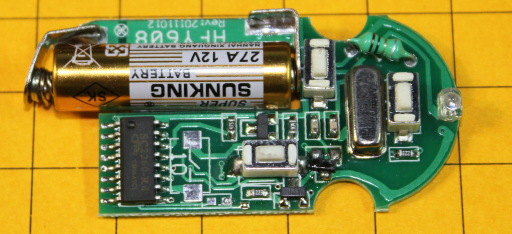 Removing three screws from the transmitter gives access to its insides. The large cylindrical object is a 12 volt "27A" battery.