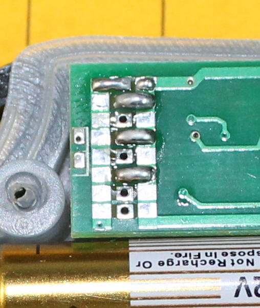 The battery, encoder chip and three switches can be seen from the other side of the board. The LED is at the far right.