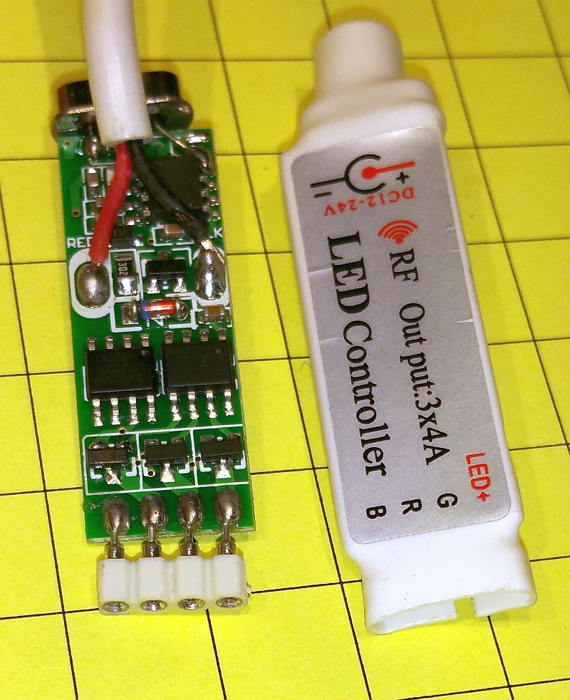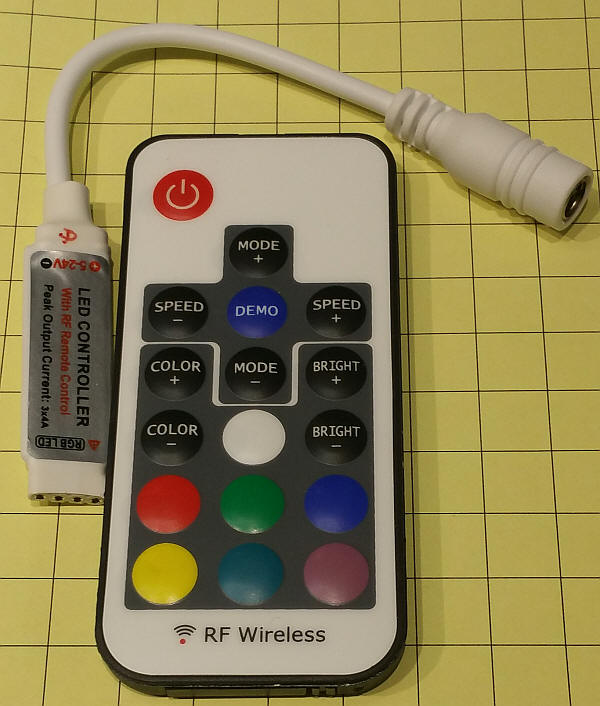 Introduction There are a number of inexpensive (< $10.00) radio control units that have come to market that may have model railroad control applications. These controllers are designed to connect to LED strip lights, either of a single color or of the RGB variety (R=red, G=green, B=blue) I have done some experimenting with a few of the devices I have found on eBay, Amazon and from other vendors. Some of these devices communicate from the transmitter to the receiver via infrared signals and other use RF (Radio Frequency). I have limited my experiments for this article to RF devices as they generally have greater range and can operate around barriers (IR units require line-of-sight operation) The devices to be explored also are designed to operate RGB LEDs so that one color can be used to control the engine speed while another color is used to toggle a DPDT (Double Pole Double Throw) relay to reverse the motor's direction of rotation. If you have no need to reverse your train you can use one of the simpler, one color controllers.