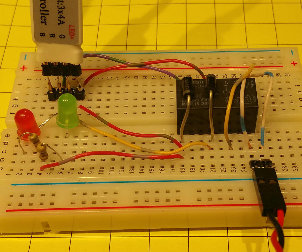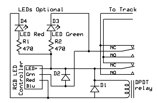 The Circuit The schematic shows the output from the LED Controller going to a DPDT relay. Diodes D1 and D2 protect the internal components in the controller from back EMF from the engine's motor and the relay. LEDs D3 and D4 and resistors R1 and R2 are optional. They are useful during development as they give a visual indication of the state of the relay and the power going to the motor. The input power to the LED Controller is not shown on the schematic. I used 18 volts for a G scale engine. Anything from 12 to 24 is acceptable. The prototype circuit is shown here on a solderless breadboard. The four terminals on the LED Controller are labeled "LED+", the common positive connection, "G", for Green, "R", for Red and "B", for Blue. The connections on the solderless breadboard closely follow the schematic. The relay (black object to the right) is a 12 volt, DPDT. The two diodes go over the relay - note the silver bands on them and their orientation. Power to the track is via the twisted red/black wire in the bottom right. The two LEDs are optional.