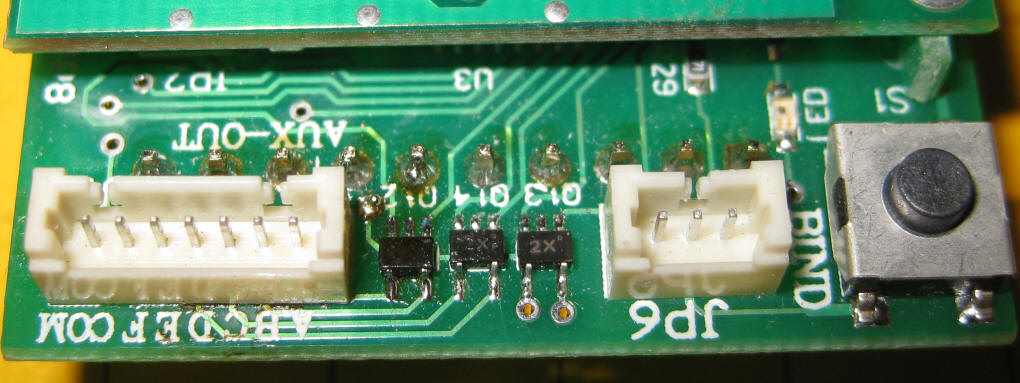 The photo here shows the smoke board. The four devices at the top are diodes that accept power of either polarity. The 8 pin device at the bottom is a Mosfet that turns the power on or off based on the input signal from the receiver. It is part # FDS4435BZ.