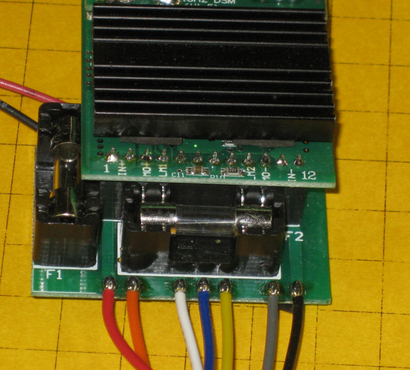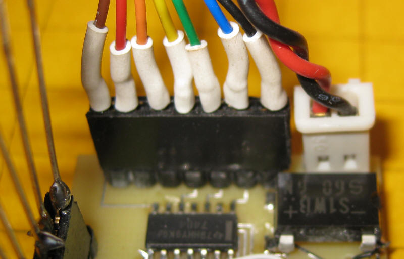 This photo shows the 7 wire auxiliary cable connected to the interface board. The black wire goes to the right and the other six follow in sequence. The red and black wires far to the right go to the track or battery power pick up connections.