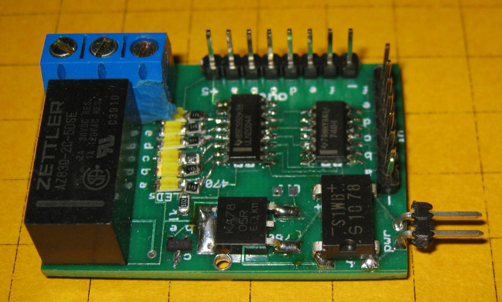 The board shown here has only a few components. There are two surface mount integrated circuits, a bridge rectifier and surface mount voltage regulator. In addition there is a DPDT relay that can be used to control devices that need an amp or more to operate.