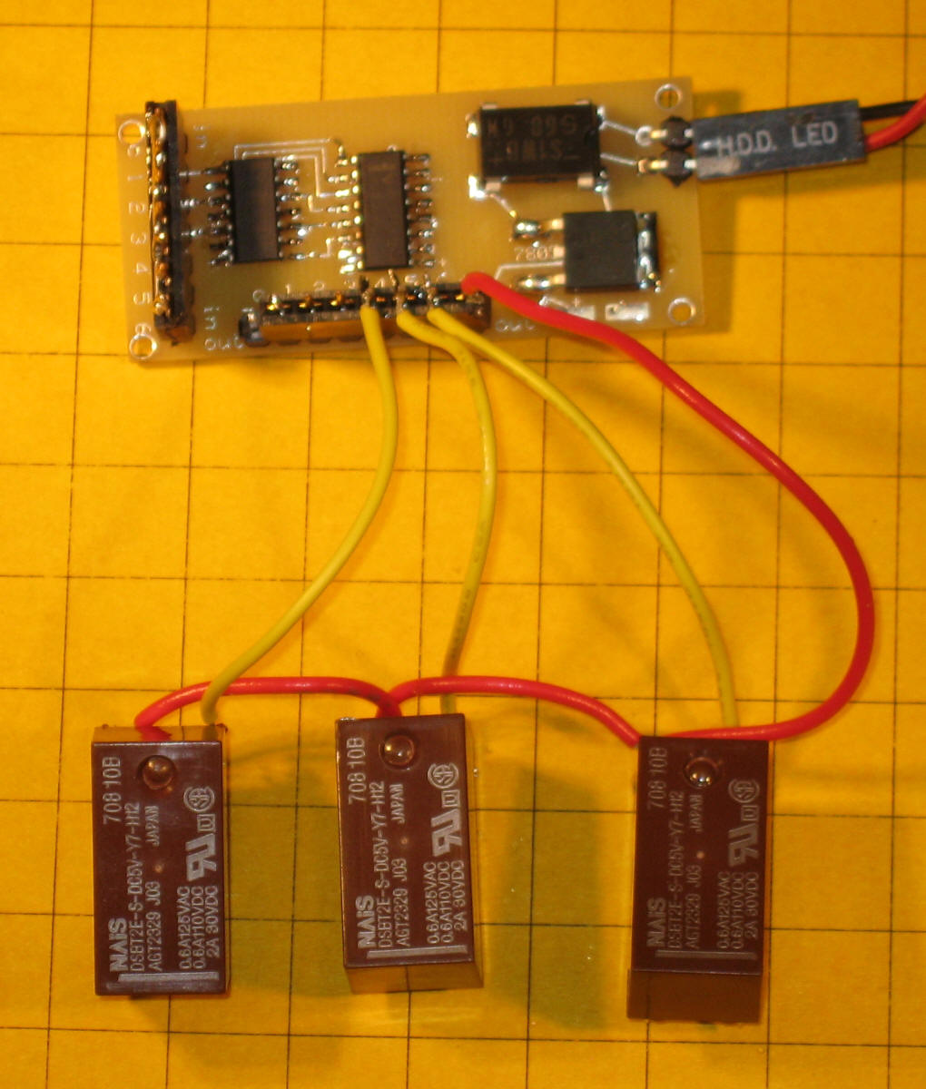 The test setup shown below was used to determine the power handling capacity of the circuit when used with three 5 volt DPDT relays.