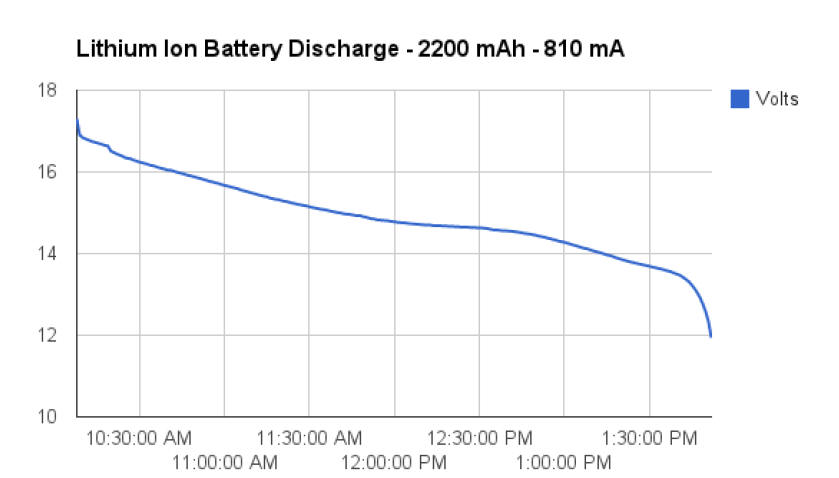 The graph for charging is below. With the current restricted to 200mA it took about 12 hours before the circuitry in the battery shut down the charging (note the spike in voltage at the end indicating that it stopped taking a charge)