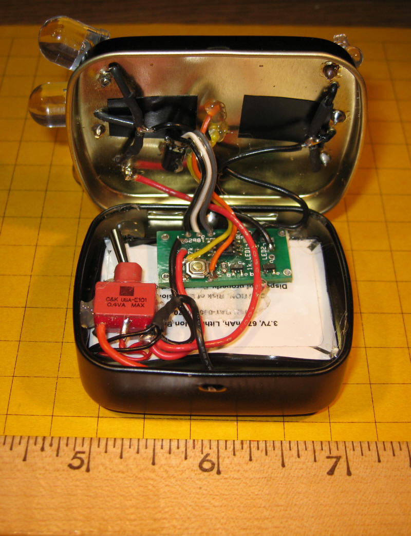For those of you who would like a less permanent installation or who would like to have the option of moving the light from helmet to helmet you can easily mount the circuit board, battery and LEDs in a small box as shown in photo #7. The DS18B20 is in the lid just left of center and the yellow and orange wires go to an externally mounted mode button. You will also note that the positive lead from the circuit board goes directly to the metal case as do the anodes from the six LEDs. This simplifies wiring as the only leads that come back from the LEDs to the circuit board are those from the cathodes. The SPDT toggle switch turns the unit on and off. When the switch is off the rechargeable battery connects to a charging plug (hidden from view in this photo) so that you cannot inadvertently apply charging voltage to the circuit.