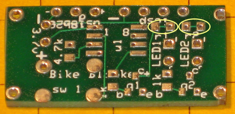 Attach the resistors (1 K or 1.5 K) and Mosfets to the board. There is a spot on the board where a resistor can be added for each LED. This set of pads is jumpered by a small trace (circled in Photo #6) in the event that you don't need a current limiting resistor. If one is to be used you must cut that connecting trace before adding the resistor. I have run the unit using the LEDs shown here without current limiting resistors and have had good results. If you increase the input voltage to 5 volts you would surely need to add 50 or 100 ohms in series with the LEDs to keep from damaging them.