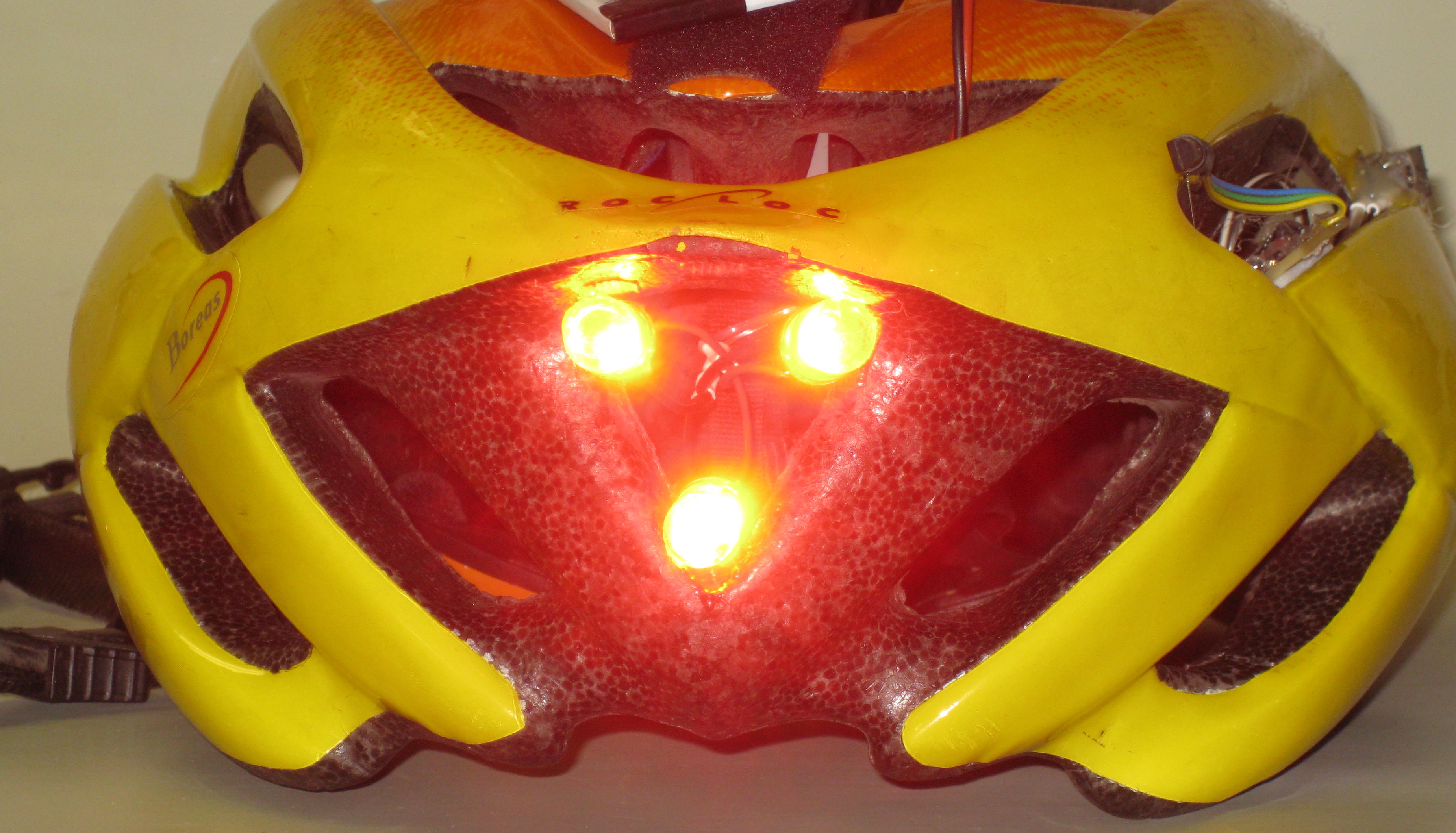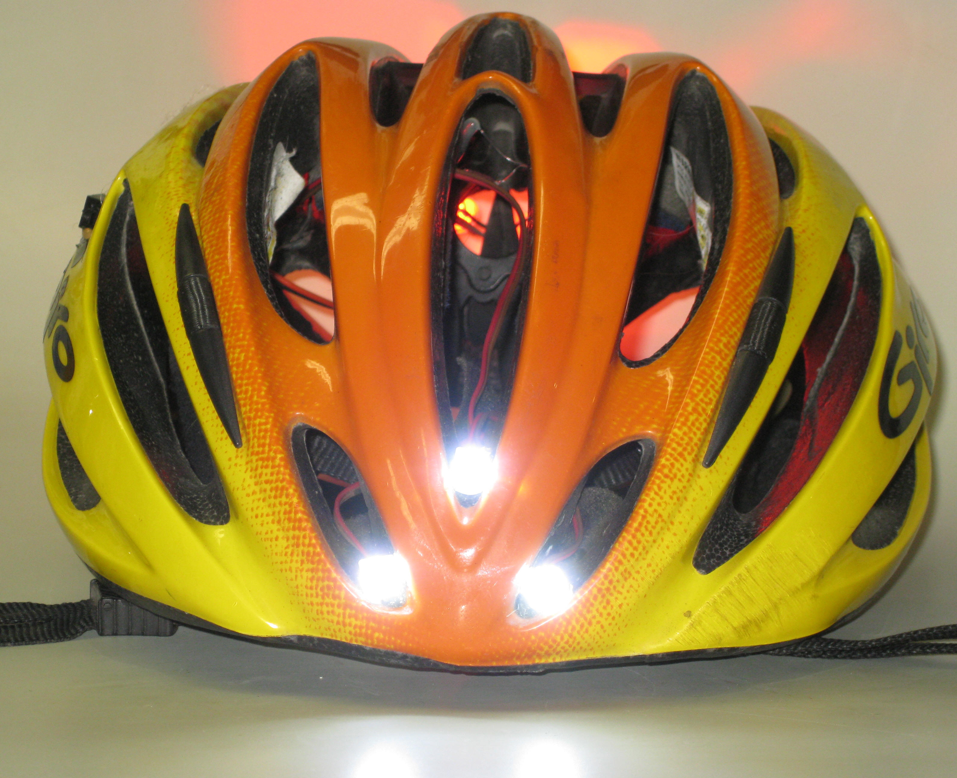 In order to give motorists the best chance of seeing my lights I like to have at least some illumination on my helmet. This is usually the highest point on a cyclist and the most likely to be noticed. The first version of this lighting system was made by mounting three bright white LEDs on the front of my helmet and three bright red LEDs on the back. A simple flashing circuit used a PIC 12F683 microcontroller. A single push button switch allowed for the selection of a number of different flashing modes and sequences. While this worked well it did little more than what was available with many commercial units.