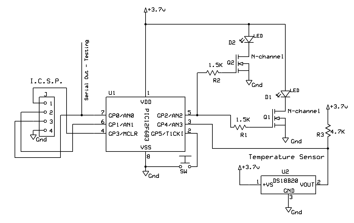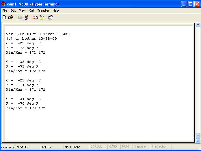 A temperature report always starts with a rapidly blinking sequence where the LEDs flicker for 1/2 second or so. Next the number of hundreds of degrees is flashed out followed by a short pause, the number of tens, another pause and the number of ones. The software suppresses the reporting of hundreds of degrees if the temperature is below 100. When reporting numbers of degrees the LEDs flash at a rate of about 1/3 second on and 1/3 second off . When reporting a zero they flash on and off much more rapidly. These rates can easily be changed in the software but have worked well throughout a full year of testing.
