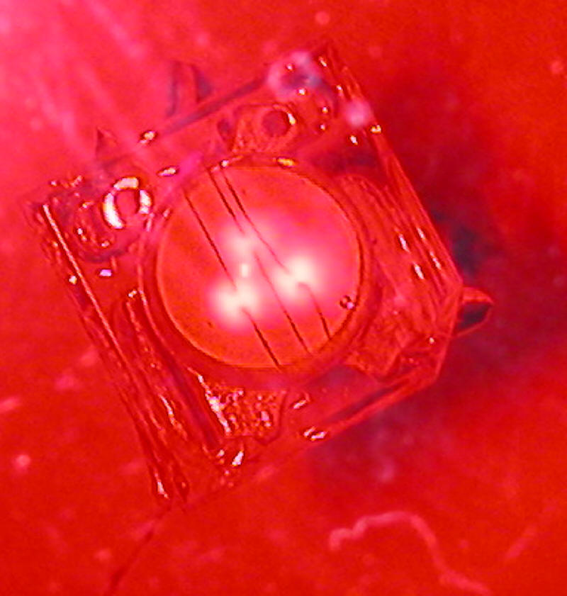 Each 5 mm LED enclosure contains three discrete LEDs. Photo #3 was taken through a red filter and shows one of the LEDs operating at a very low voltage. Because the intensity of the LED's light has been dramatically diminished you can clearly see the three points of light from each of the LEDs and the wires that are connected to them.