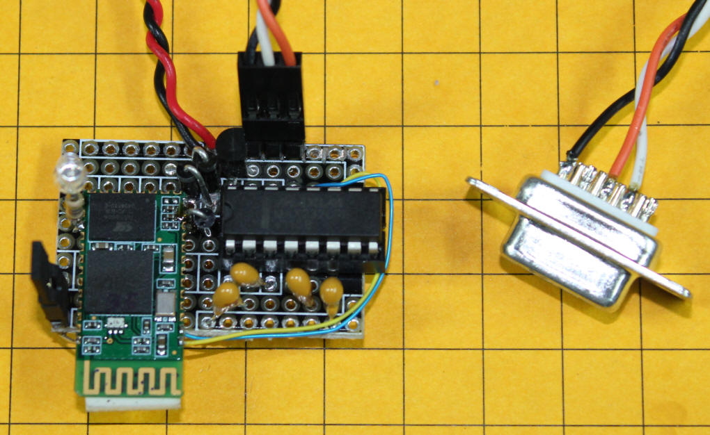 Circuit Prototype This photo shows the circuit built for testing on a prototype board. The Bluetooth module is at the left. The jumper is in the far left. The 3 pin header connects to the DB-9.