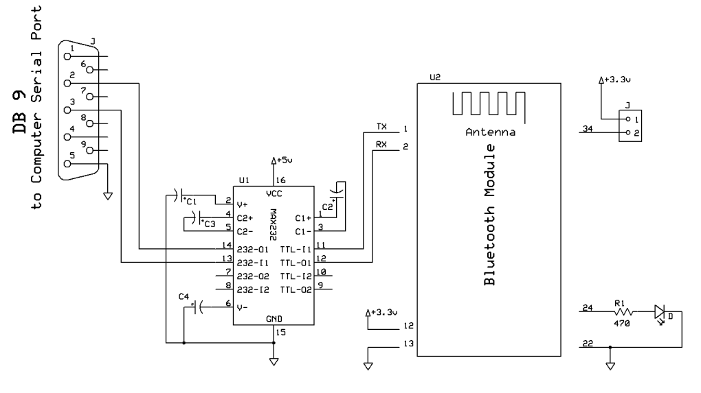 MAX232 Circuit The circuit that I used is shown below. The capacitors are tantalum 4.7 uf devices. The documentation for the MAX 232 calls for 1 uf but all I had on hand were the 4.7s and they work fine. I used a 5 volt regulator (78L05) to supply the MAX232. To get the lower voltage for the module I put three silicon diodes in series dropping the 5 volts to 2.9 volts. The circuit performs very well and allows direct connection between the Bluetooth module and either my Android device or the computer. It also works with both PIC and PICAXE microcontrollers. The program that I use on the computer is called Tera Term. Since Windows 7 does not include HyperTerminal it is a good substitute and the price is right (freeware!).