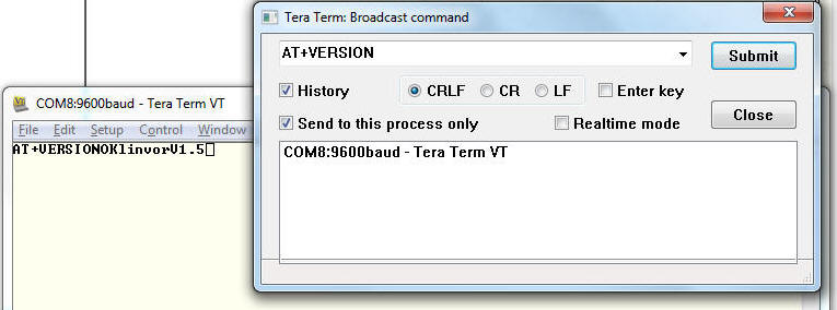 AT Commands In order to put the module into command mode, which is used to change the baud rate and name, you need to connect pin 34 to the positive voltage terminal. The schematic shows a jumper that can be used to connect these contacts. When I first go the module working with Tera Term I typed AT on the terminal and the module responded OK. I tried other commands that were in various documents that I found and never received a reply from the device. A bit of experimentation determined that just typing the commands did not serve to communicate with the module. I needed to use a different method. Using Tera Term I selected CONTROL from the pull down menu then BROADCAST COMMAND. With the settings shown below I was able to communicate with the Bluetooth module. As you can see the command "AT+VERSION) returns "linvolV1.5". Other commands that work with these modules include: AT+NAMEnewnamehere can be used to change the name of the module. Using AT+NAMEDE-three changes the name to "DE-three" AT+PINxxxx sets the password (PIN number) - I have not tested this as I left all of my modules set to the default 1234 AT+BAUD# where # is a digit between 1 and 9