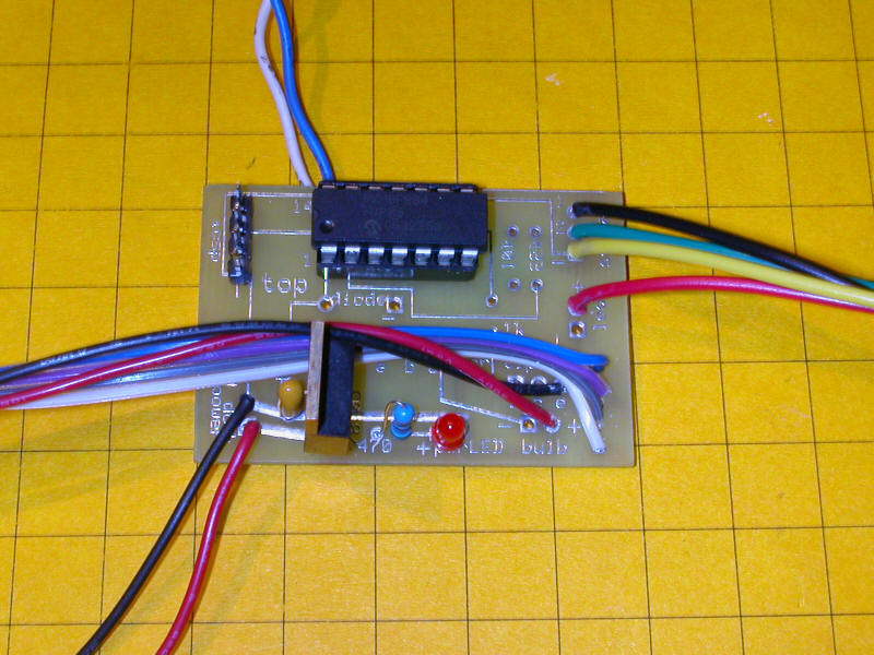 | Circuit Board The control unit is made up of two boards. The first board contains the power supply circuit, the microcontroller and the interface for the infrared sensors. The sensor connects through the four wires that go to the right. The secondary board connects through the six wires that go to the left. Power is supplies through the red and black wires at the bottom. The blue and white wires go to the PC's serial port for testing. They will not be on the finished circuit.