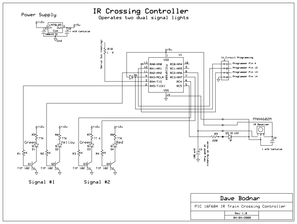 | Schematic 16F684 The signal LEDs are in the lower left. They are labeled appropriately in the schematic. Note that the current limiting resistor between the LED and the 12 volt power supply is marked "??K" as this value must be determined by the end user.
