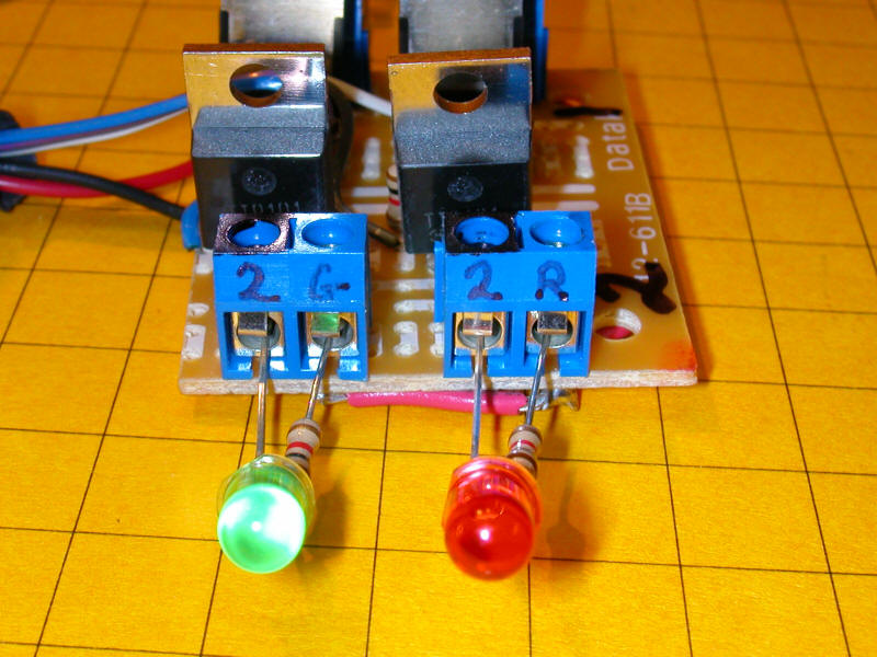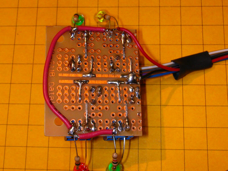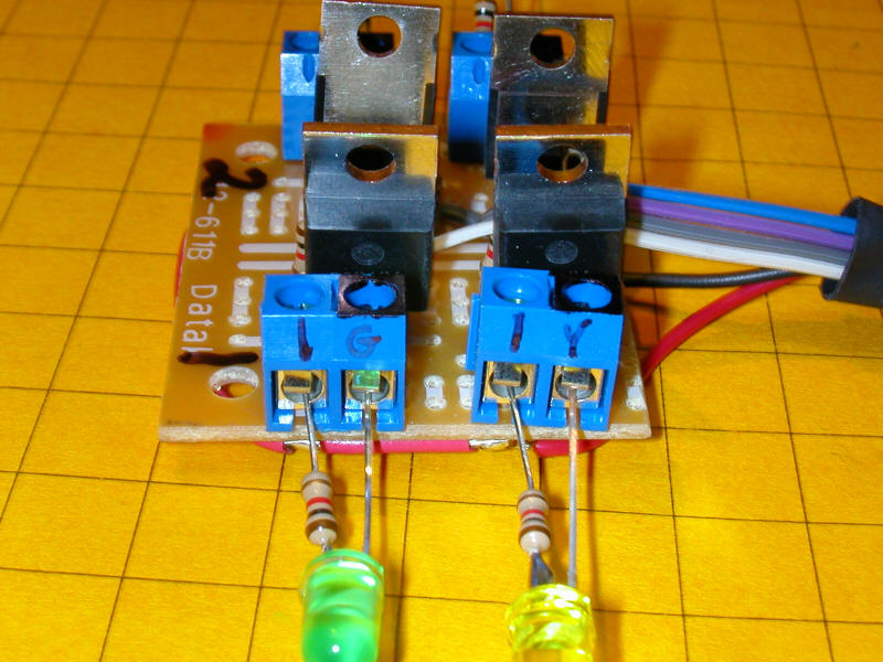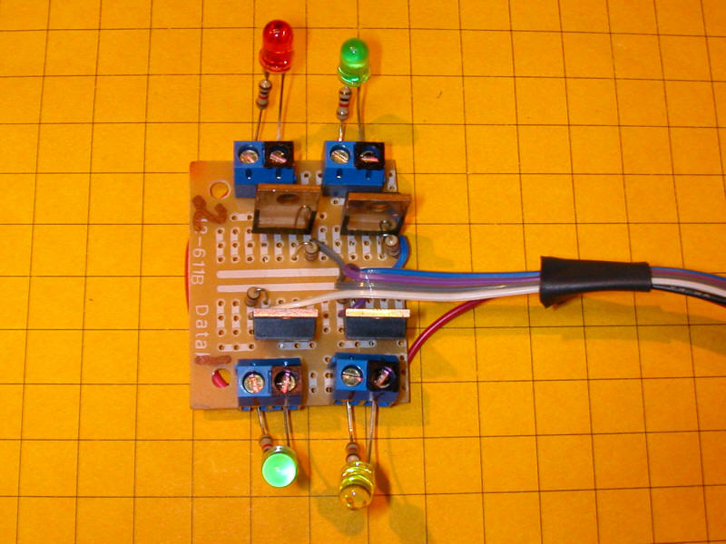 The second board supports the four TIP 101 Darlington transistors that power the signal lights and the screw connectors that connect to the signals. The negative terminal of each connector is marked in black. If LEDs are used in the signals proper polarity must be observed. Red, Green and Yellow LEDs were used for testing.