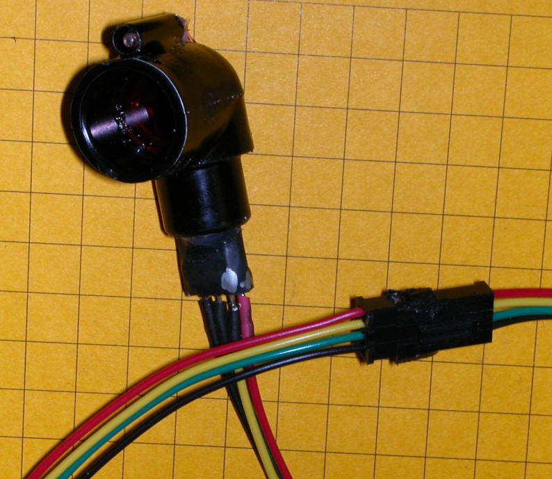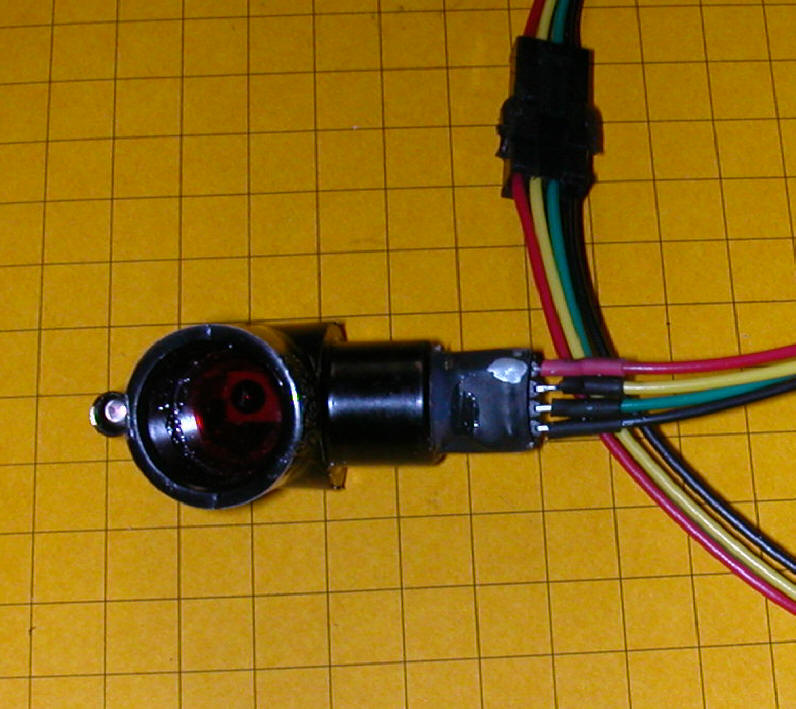 If you look carefully you can see the sensor behind the cover. The connections at the bottom of the sensor are soldered to a quick connect. Note that the connector has been filed down on the corners to fit through the plastic pipe. The easiest way to extend the length of the sensor cable would be to get two more 4 conductor quick connects - they are from All Electronics (part # CON-440) The positive lead of the sensor is marked with a silver + and should go to the connector's red lead.