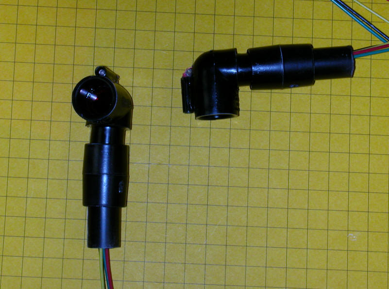 The completed sensors are shown here. The IR emitter is in the small brass tube at the top. The IR sensor is behind a piece of red Plexiglas inside of the plastic pipe.