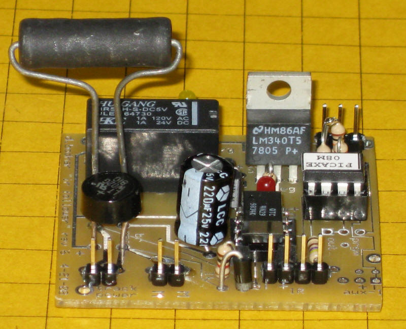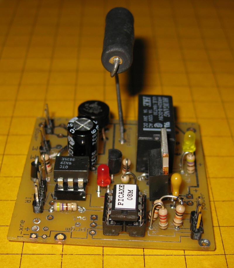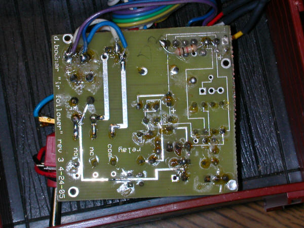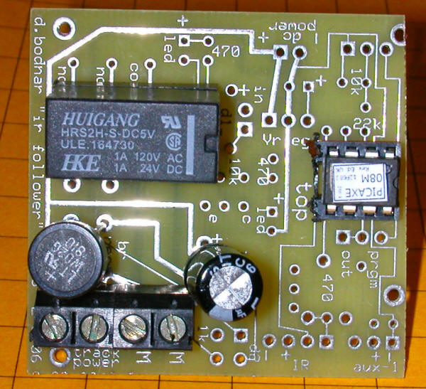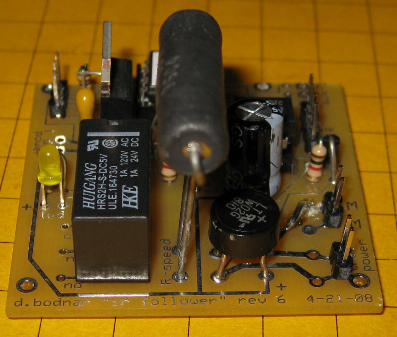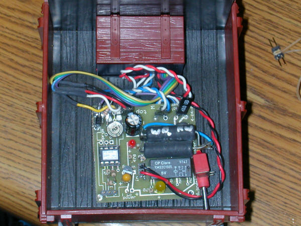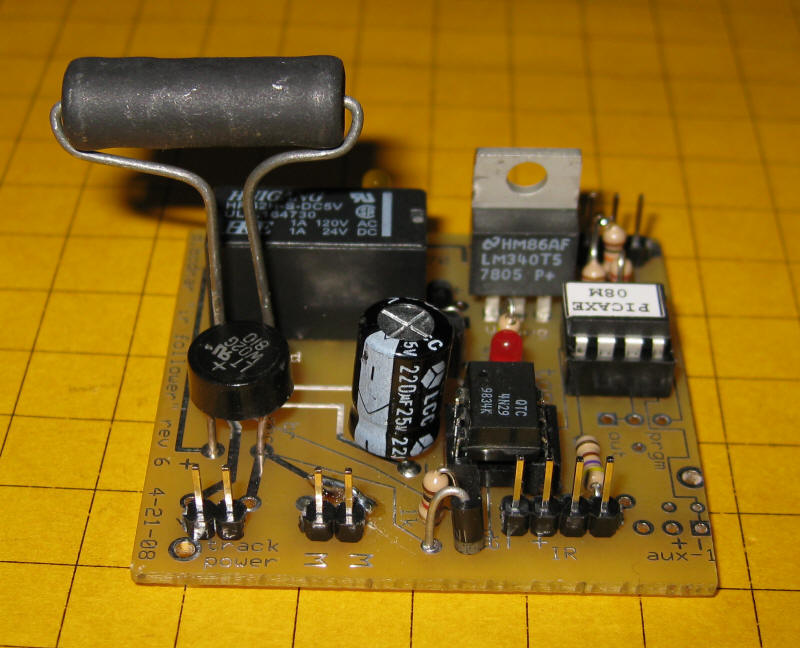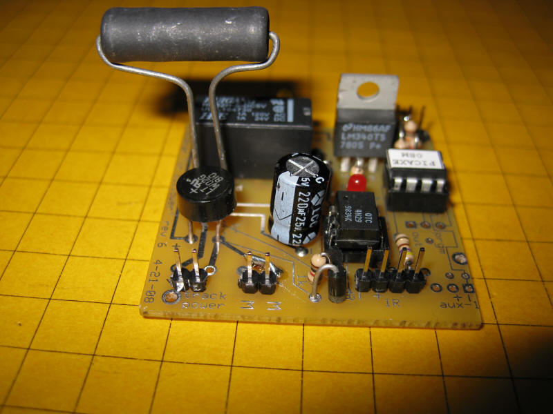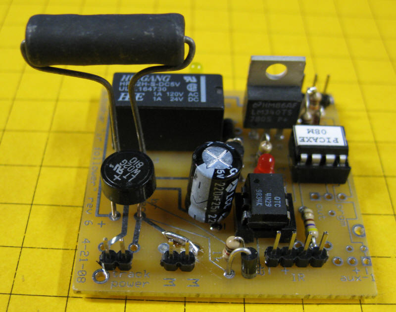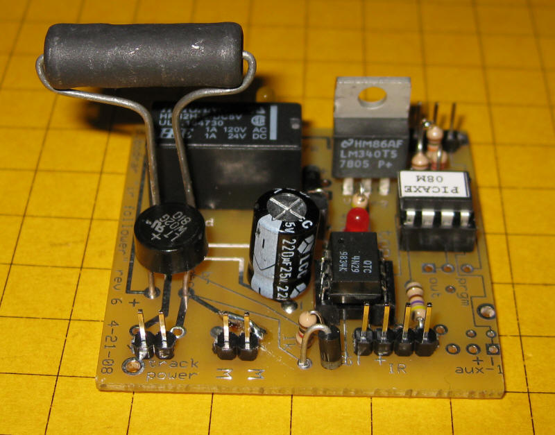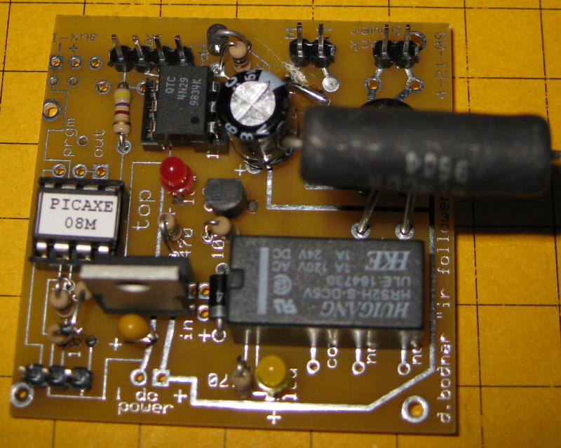 Click here for the original construction manual in Word format. The PICAXE and the DPDT relay are both in sockets. The 4 pin screw connector (top row center) can be used or two 2 pin headers can be used if space is a problem as the capacitor may hit the screw connector. There are two IR LEDs - on3 3mm and one 5mm - either can be used. A pot is included to vary the power to the IR LED but it can be bypassed and the 180 or 220 ohm resistor can be used for current limiting. The two 18 ohm power resistors are in the lower left. Some experimentation will be needed to determine if one or both should be used. In the rail truck application (shown below) the two resistors are in series with a switch that can short out the 2nd resistor. When the switch is "off" the resistance is 36 ohms and the slowing is significant. When the switch is "on" the resistance is 18 ohms and the slowing is less. |