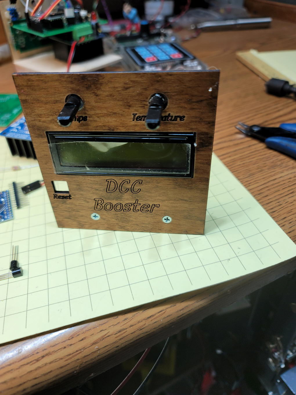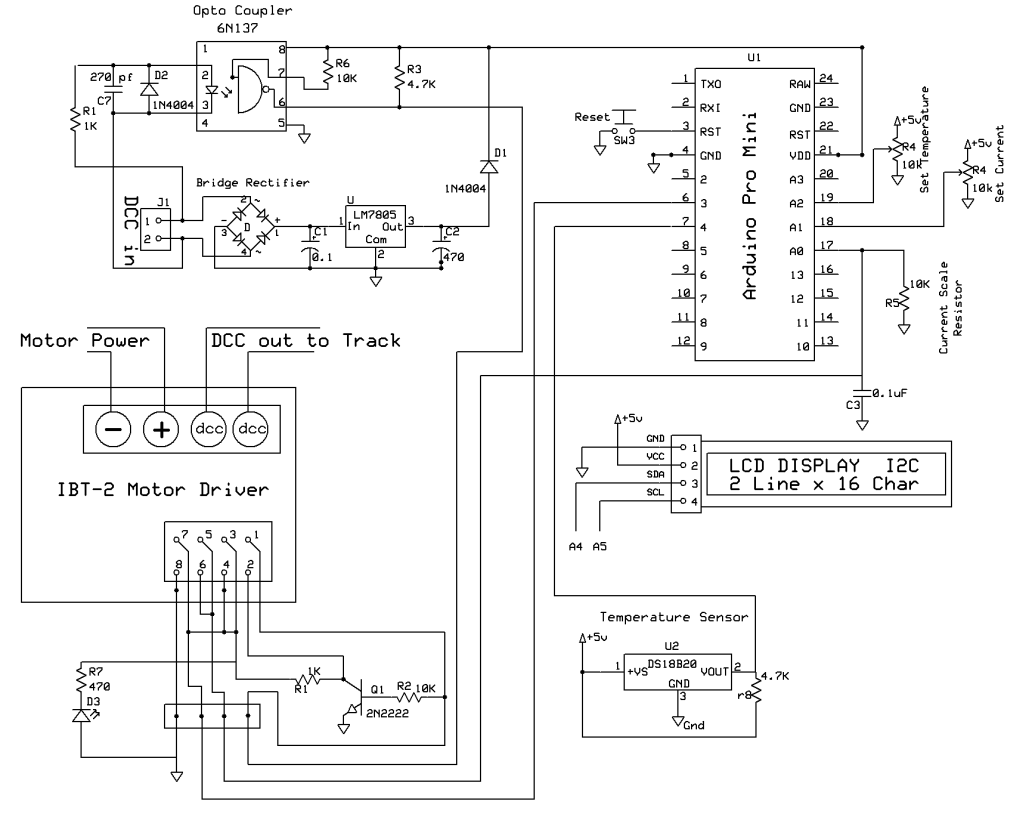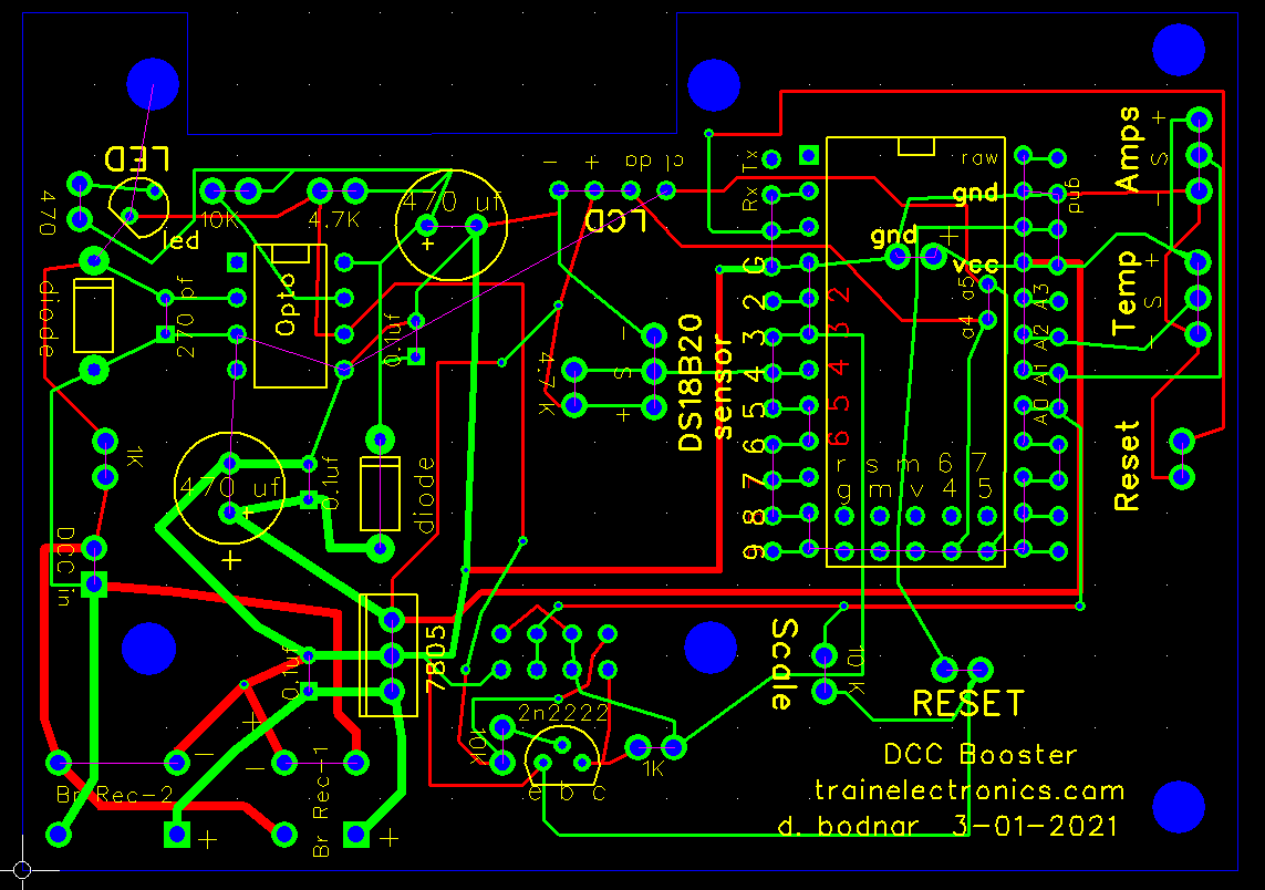 Arduino Code The code for the booster is below. Version: DCC_Booster_NEW_Board-v3-2 Please note that there are several libraries that must be included. /* As posted on web page - uses modified board DCC Booster using the 43 amp H-Bridge from eBay & Amazon */ #include <OneWire.h> #include <DallasTemperature.h> #define ONE_WIRE_BUS 4 OneWire oneWire(ONE_WIRE_BUS); DallasTemperature sensors(&oneWire); DeviceAddress insideThermometer; #include<EEPROM.h> int LED = 13; // LED to blink when DCC packets are sent in loop int PowerOn = 3; // pin to turn booster on/off int Pot1 = 1; // max current pot int Pot2 = 2; // max temperature pot float PotReading = 0; float TmpPotReading = 0; int CurrentPin = 0; int CurrentPinReading = 0; int SetPotFlag = 0; float version = 3.2; #include <Wire.h> #include <LCD.h> #include <LiquidCrystal_I2C.h> #define I2C_ADDR 0x27 // <<----- Add your address here. Find it from I2C Scanner #define BACKLIGHT_PIN 3 #define En_pin 2 #define Rw_pin 1 #define Rs_pin 0 #define D4_pin 4 #define D5_pin 5 #define D6_pin 6 #define D7_pin 7 LiquidCrystal_I2C lcd(I2C_ADDR, En_pin, Rw_pin, Rs_pin, D4_pin, D5_pin, D6_pin, D7_pin); unsigned long time; unsigned long now; long cAverage = 0; int avgTimes = 400; int lastAverage = 0; int resetFlag = 0; float percentage = 0; int temp1 = 0; float tempC = 0; int CurrentAdjustValue = 300; // adjust based on current Scale resistor value void setup() { delay(500); pinMode(LED, OUTPUT); pinMode(PowerOn, OUTPUT ); lcd.begin (16, 2); // LCD is 16 characters x 2 lines lcd.setBacklightPin(BACKLIGHT_PIN, POSITIVE); lcd.setBacklight(HIGH); // Switch on the backlight lcd.home (); // go home Serial.begin (115200); lcd.setCursor(0, 0); lcd.print("DCC Booster"); lcd.setCursor(0, 1); lcd.print("5-05-21 - v"); lcd.print(version, 1); Serial.print("5-09-2021 version "); Serial.println(version, 1); delay(1000); lcd.clear(); delay(500); now = millis(); Serial.print("Locating devices..."); sensors.begin(); Serial.print("Found "); Serial.print(sensors.getDeviceCount(), DEC); Serial.println(" devices."); Serial.print("Parasite power is: "); if (sensors.isParasitePowerMode()) Serial.println("ON"); else Serial.println("OFF"); if (!sensors.getAddress(insideThermometer, 0)) Serial.println("Unable to find address for Device 0"); Serial.print("Device 0 Address: "); printAddress(insideThermometer); Serial.println(); // set the resolution to 9 bit (Each Dallas/Maxim device is capable of several different resolutions) sensors.setResolution(insideThermometer, 9); Serial.print("Device 0 Resolution: "); Serial.print(sensors.getResolution(insideThermometer), DEC); Serial.println(); } // NOTE: about 0.014 amps / digit of reading with 10K resistor on sense line void loop() { sensors.requestTemperatures(); // Send the command to get temperatures printTemperature(insideThermometer); // Use a simple function to print out the data PotReading = analogRead(Pot1); PotReading = PotReading / 100; TmpPotReading = analogRead(Pot2); TmpPotReading = TmpPotReading / 10; lcd.setCursor(0, 1); lcd.print("TMP"); lcd.print (DallasTemperature::toFahrenheit(tempC), 0); // Converts tempC to Fahrenheit int temptemp = (DallasTemperature::toFahrenheit(tempC)); lcd.print("/"); lcd.print(TmpPotReading + 100, 0); lcd.print((char)223); lcd.print(" "); if (temptemp > TmpPotReading + 100) { Serial.println("TEMPERATURE FAULT ! ! !"); lcd.setCursor(0, 1); lcd.print("T FAULT!"); } lcd.setCursor(8, 0); lcd.print("MaxA="); lcd.print(PotReading, 1); showPercentage(); resetFlag++; if (resetFlag >= 100) { resetFlag = 0; } cAverage = 0; for (int xx = 0; xx < avgTimes ; xx++) { //CurrentPinReading = analogRead(CurrentPin); if (CurrentPinReading >= 1000) { Serial.print("Value = "); Serial.print(CurrentPinReading); Serial.println(" STOPPPPPPPPPPPPPPPPPPPPPPING"); turnPowerOff(); } CurrentPinReading = analogRead(CurrentPin); cAverage = cAverage + CurrentPinReading; } CurrentPinReading = cAverage / avgTimes; Serial.print("raw current "); Serial.print(CurrentPinReading); turnPowerOn(); lastAverage = CurrentPinReading; // keep for compare & print Serial.print(" Current = "); Serial.println(CurrentPinReading - CurrentAdjustValue); // gives near zero with filter & 100K pull down } //END LOOP void showPercentage() { percentage = (CurrentPinReading - CurrentAdjustValue ) / PotReading; // was 0.014 percentage = percentage * 2; if (percentage < -0) { percentage = 0; } if (millis() - now >= 500) // only update LCD every 1/2 second to limit flicker { lcd.setCursor(11, 1); lcd.print(percentage, 1); lcd.print("% "); now = millis(); } if (percentage > 100) turnPowerOff(); } void turnPowerOff() { digitalWrite(PowerOn, LOW); lcd.setCursor(0, 0); lcd.print("OFF-5sec"); delay(5000); turnPowerOn(); lcd.setCursor(0, 0); lcd.print(" "); } void turnPowerOn() { digitalWrite(PowerOn, HIGH); lcd.setCursor(0, 0); lcd.print("PWR On"); } void printTemperature(DeviceAddress deviceAddress) { tempC = sensors.getTempC(deviceAddress); if (tempC == DEVICE_DISCONNECTED_C) { Serial.println("Error: Could not read temperature data"); return; } Serial.print("Temp C: "); Serial.print(tempC); Serial.print(" Temp F: "); Serial.println(DallasTemperature::toFahrenheit(tempC)); // Converts tempC to Fahrenheit } // function to print a device address void printAddress(DeviceAddress deviceAddress) { for (uint8_t i = 0; i < 8; i++) { if (deviceAddress[i] < 16) Serial.print("0"); Serial.print(deviceAddress[i], HEX); } }