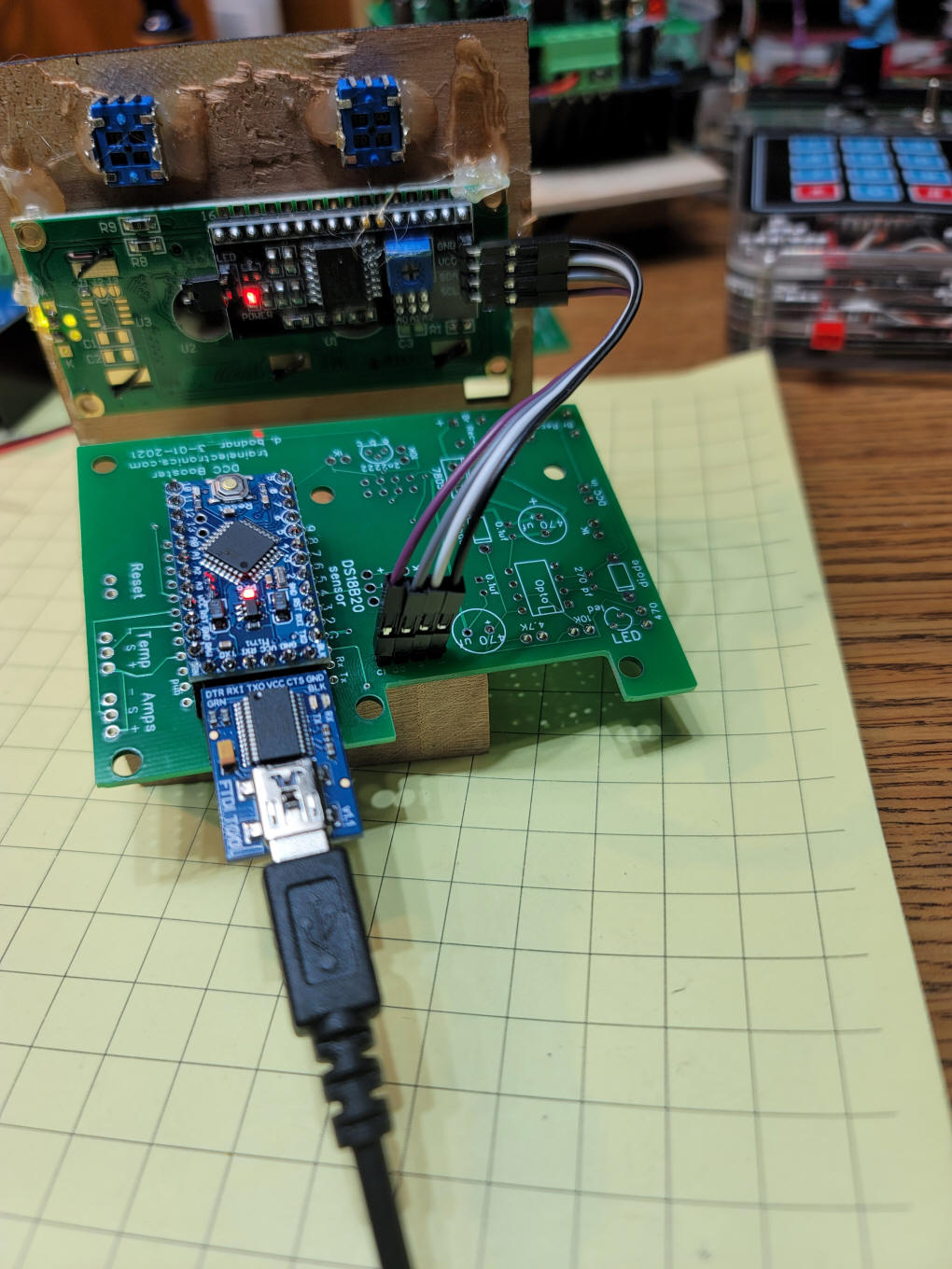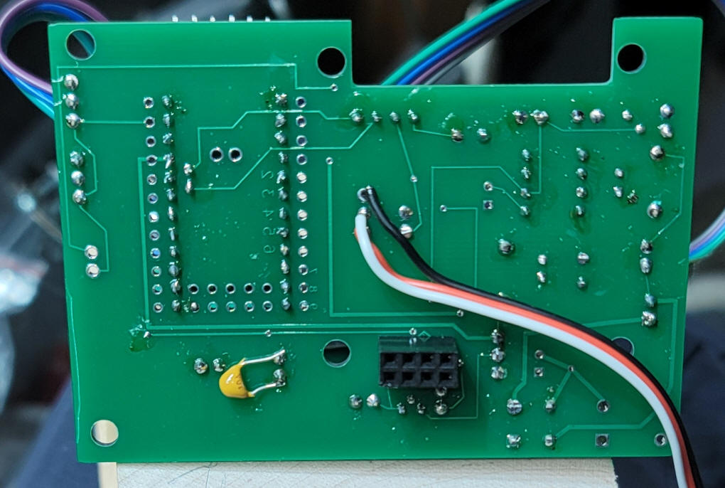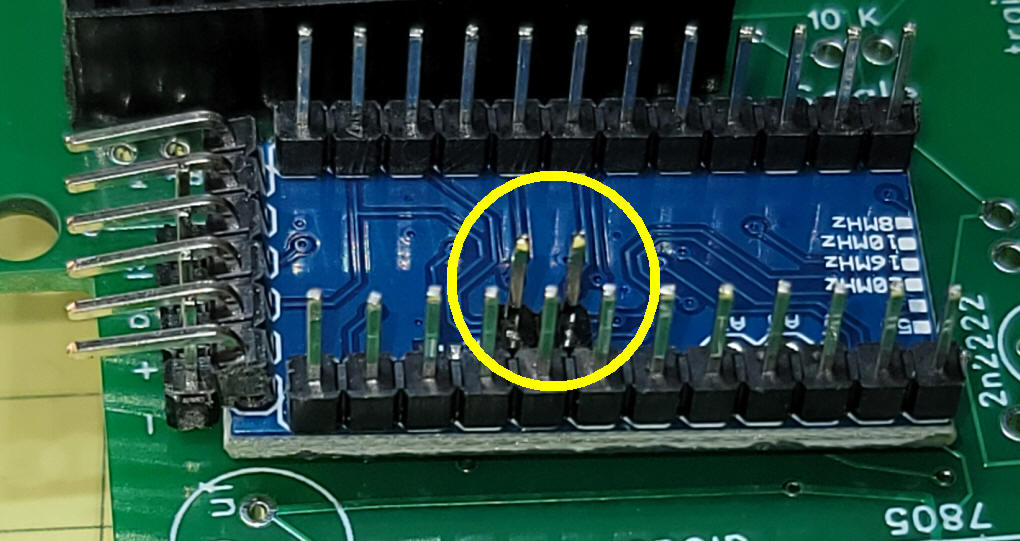 button is optional and not shown in this photo Once the socket for the Arduino is mounted and the LCD connections are made you can test programming the Arduino. At the bottom of the photo you can see the FTDI adapter that is needed to program the Arduino. These programmers are available from Amazon, with or without the Arduino. Be sure to include the two pin header on the back of the Arduino and ... ...on the circuit board. The power supply part of the circuit has